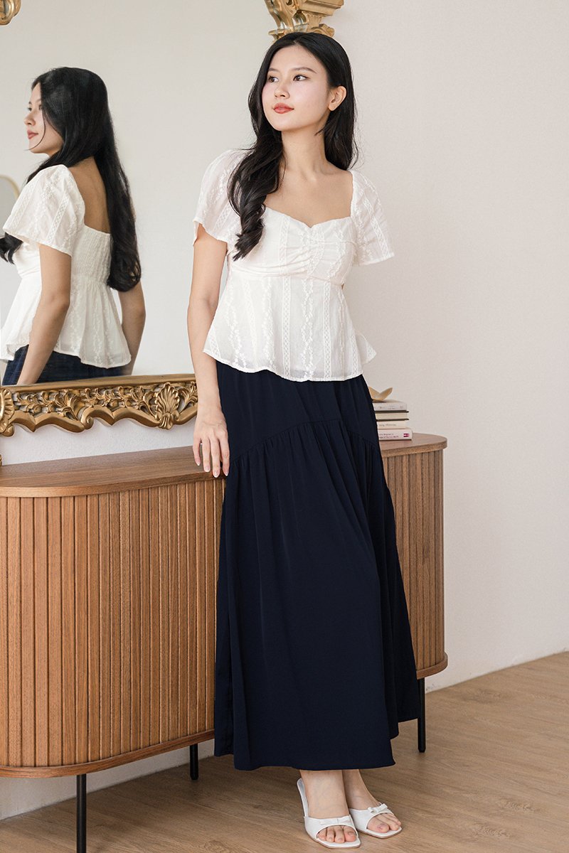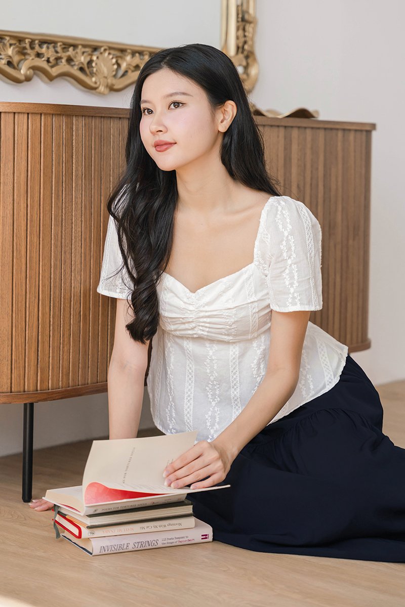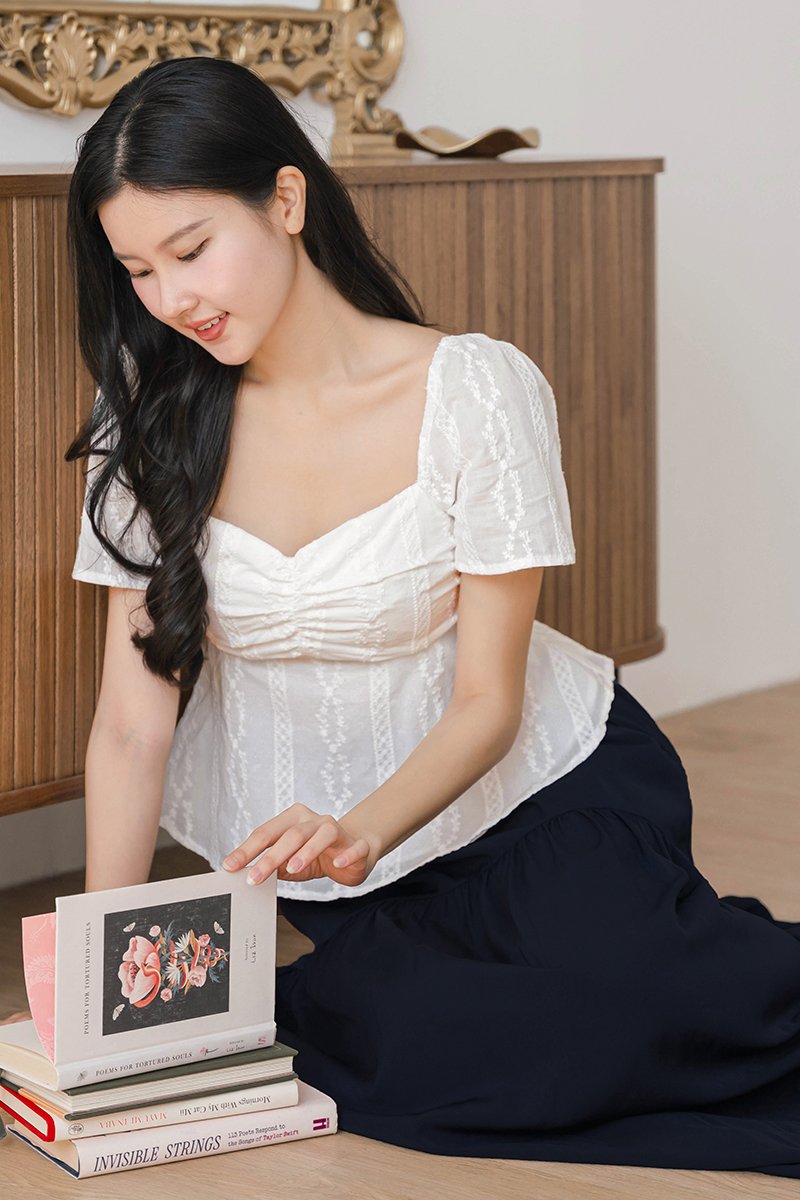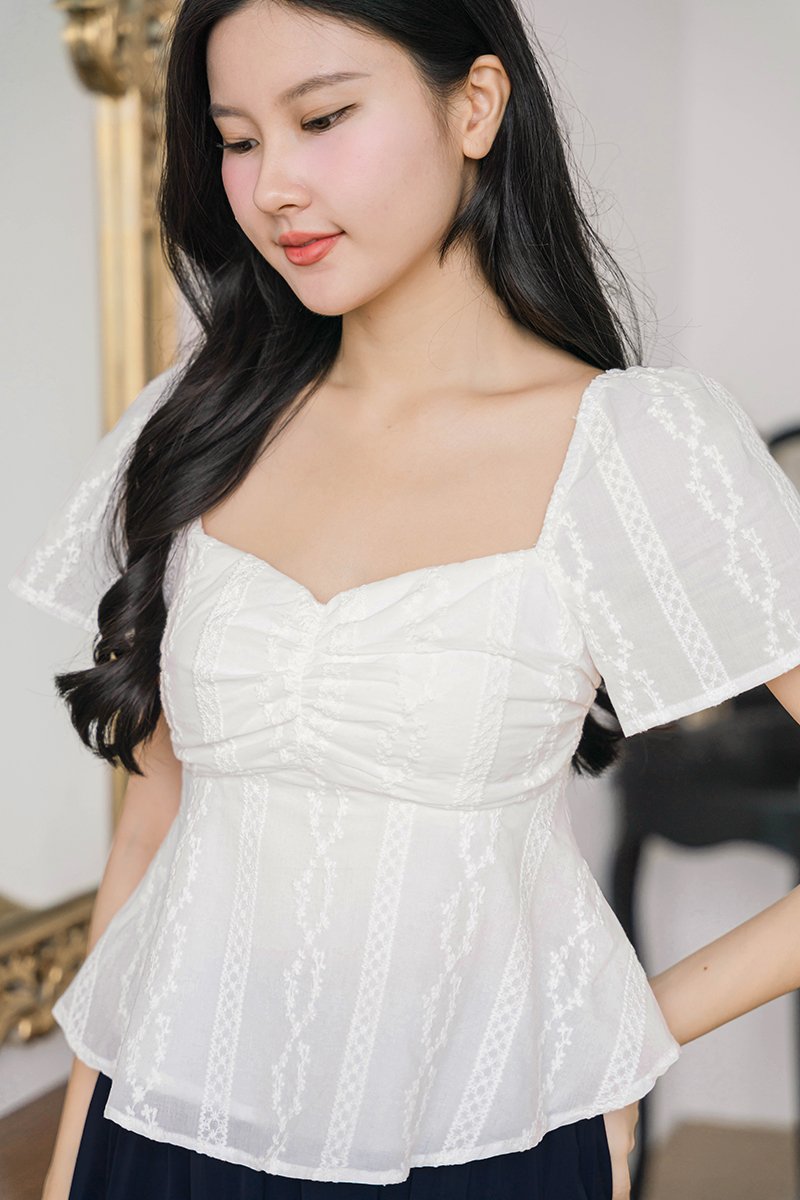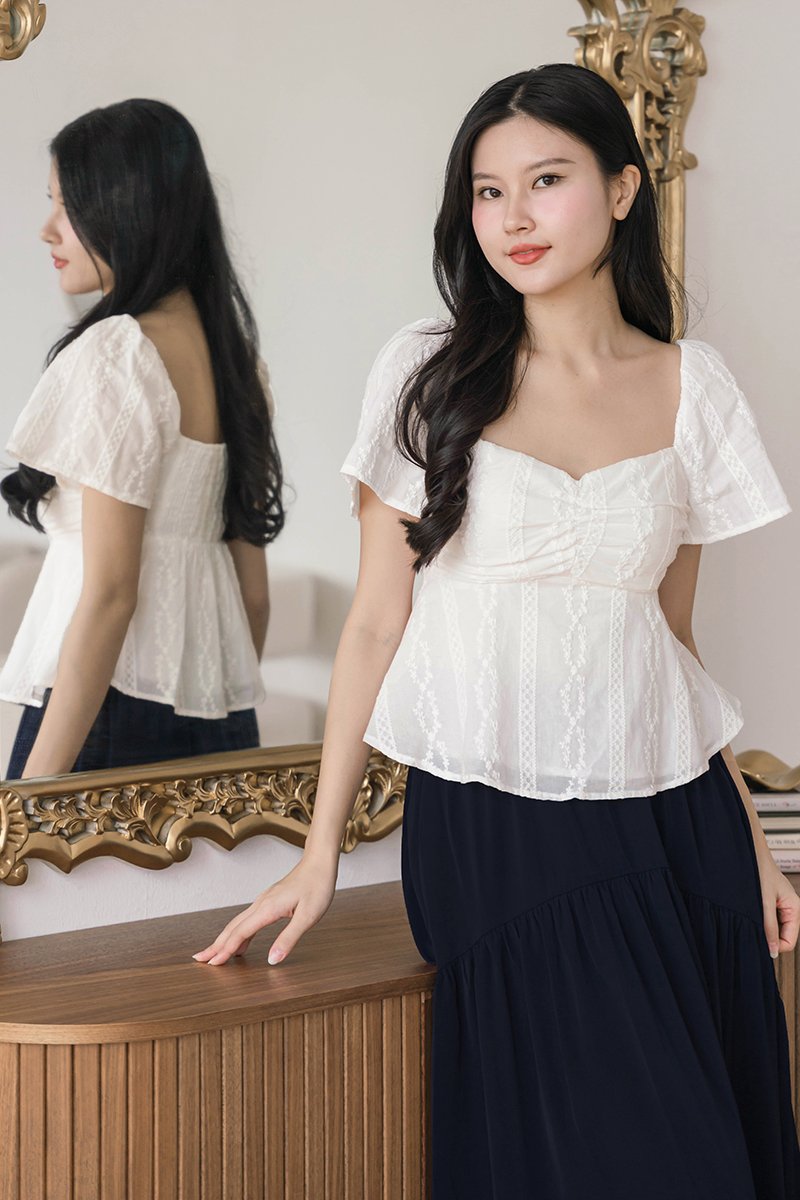 Elevate your everyday style with Angie – a peplum top that blends ruched bust design, flutter sleeves, and soft embroidered texture.