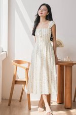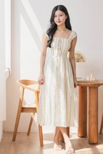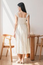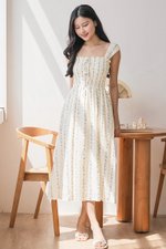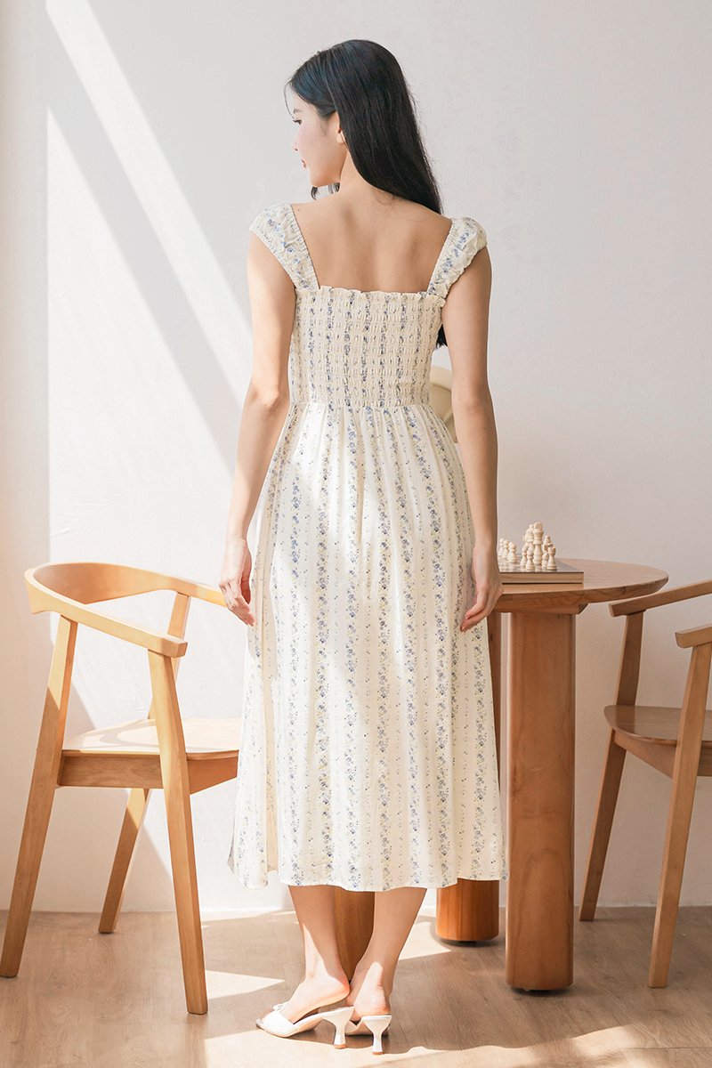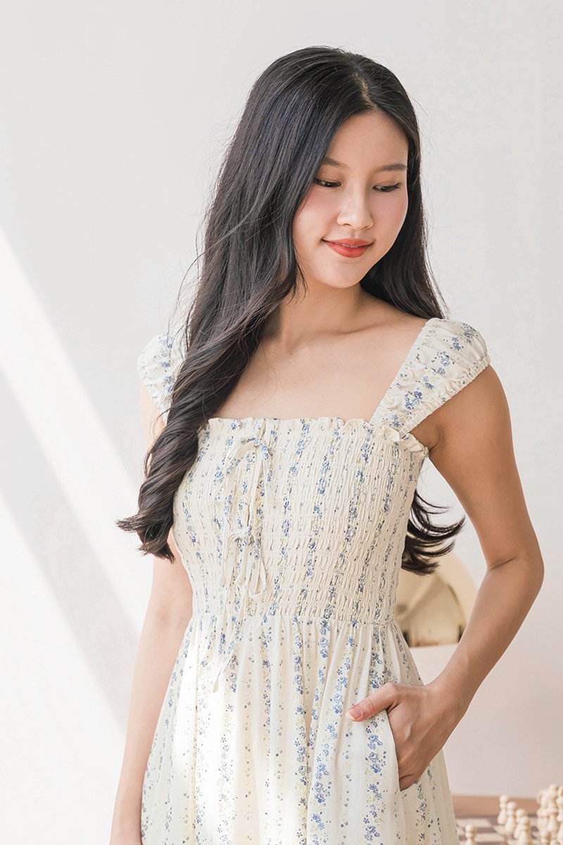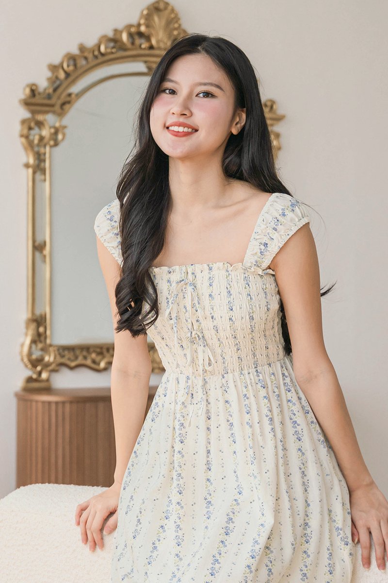 Fall in love with Bella – a charming midi dress with a fully smocked bodice that flatters your silhouette. Features capped sleeves and functional corset-like hook with ribbons at bust, flowing into an A-line bottom for effortless elegance. Perfect for garden parties, brunches, or any day you want to feel confident.