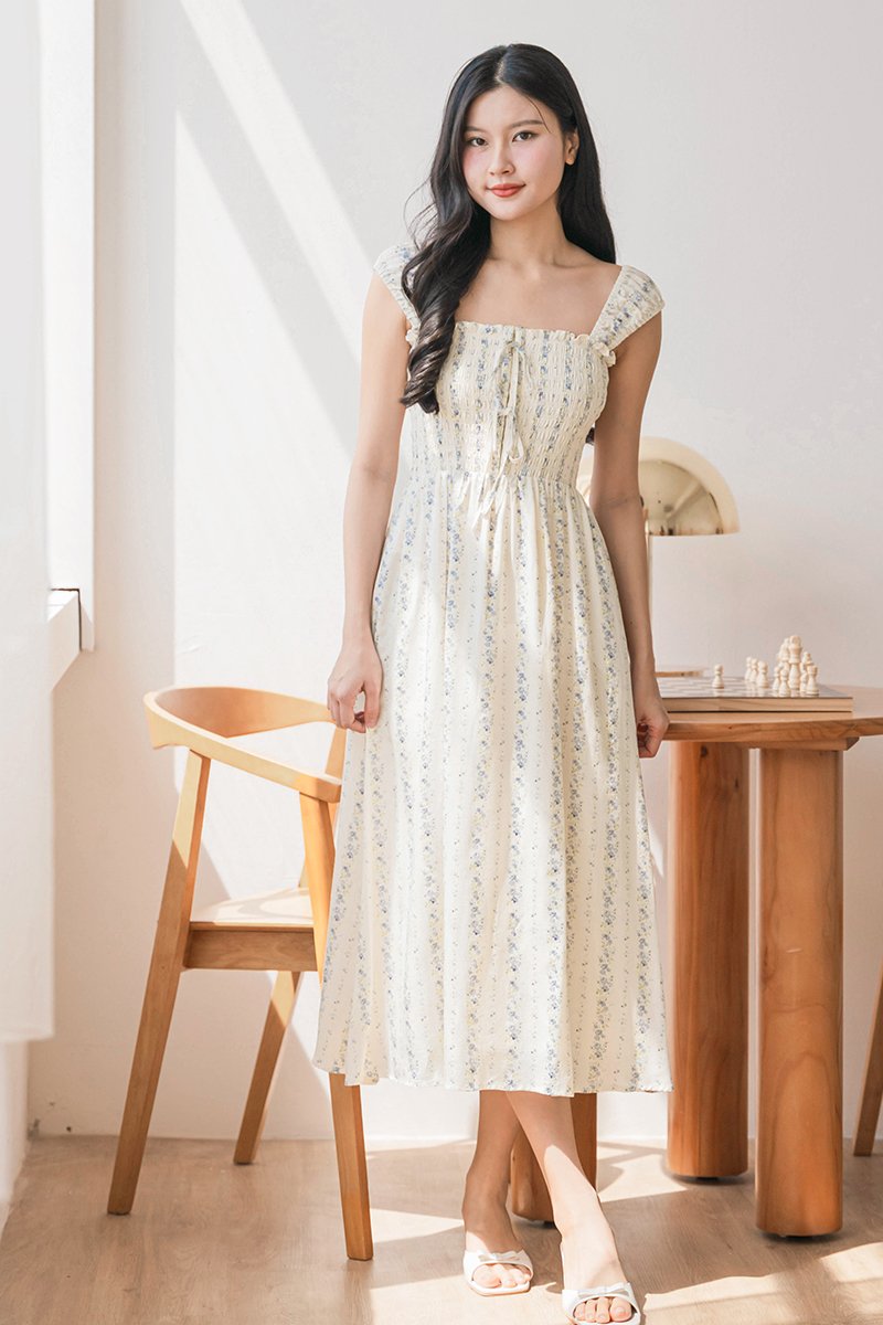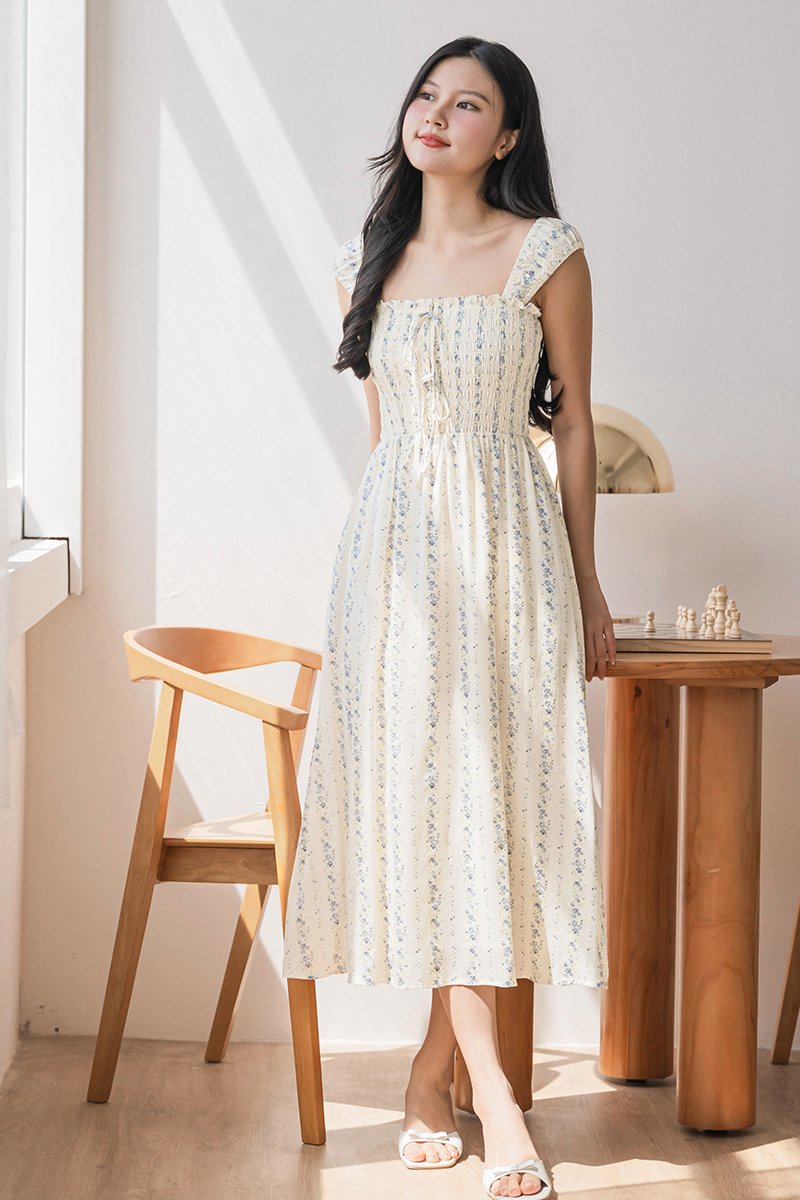 Bella Cap Sleeve Smocked Ribbon Midi Dress (Blue Floral Cottage)