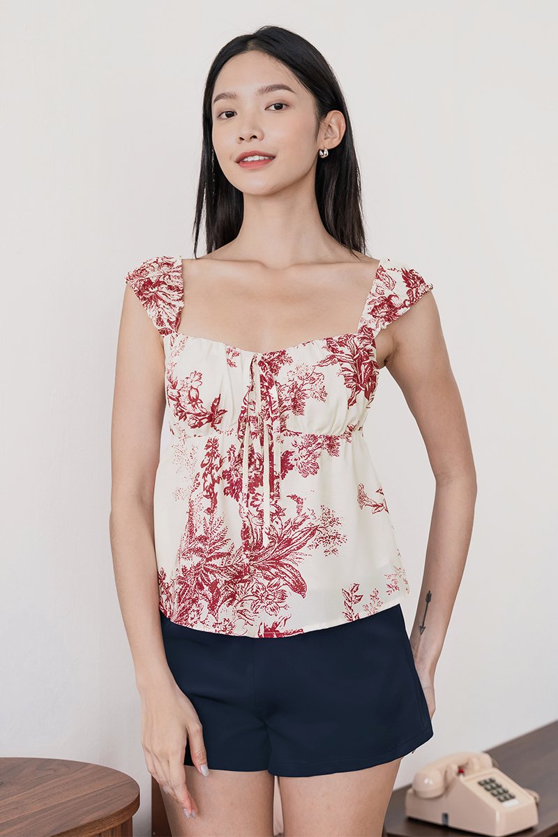 Playful yet feminine, the Britney Top charms with frilled cap sleeves and ruching at the bust, flowing into a slight babydoll flare. A touch of playfulness with dainty ribbons at the neckline and underbust completes this sweet, comfy getup.