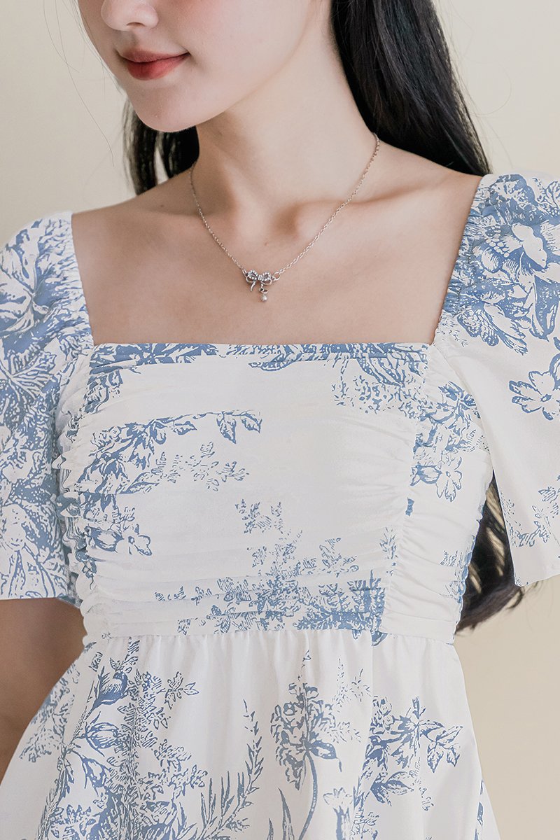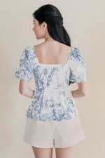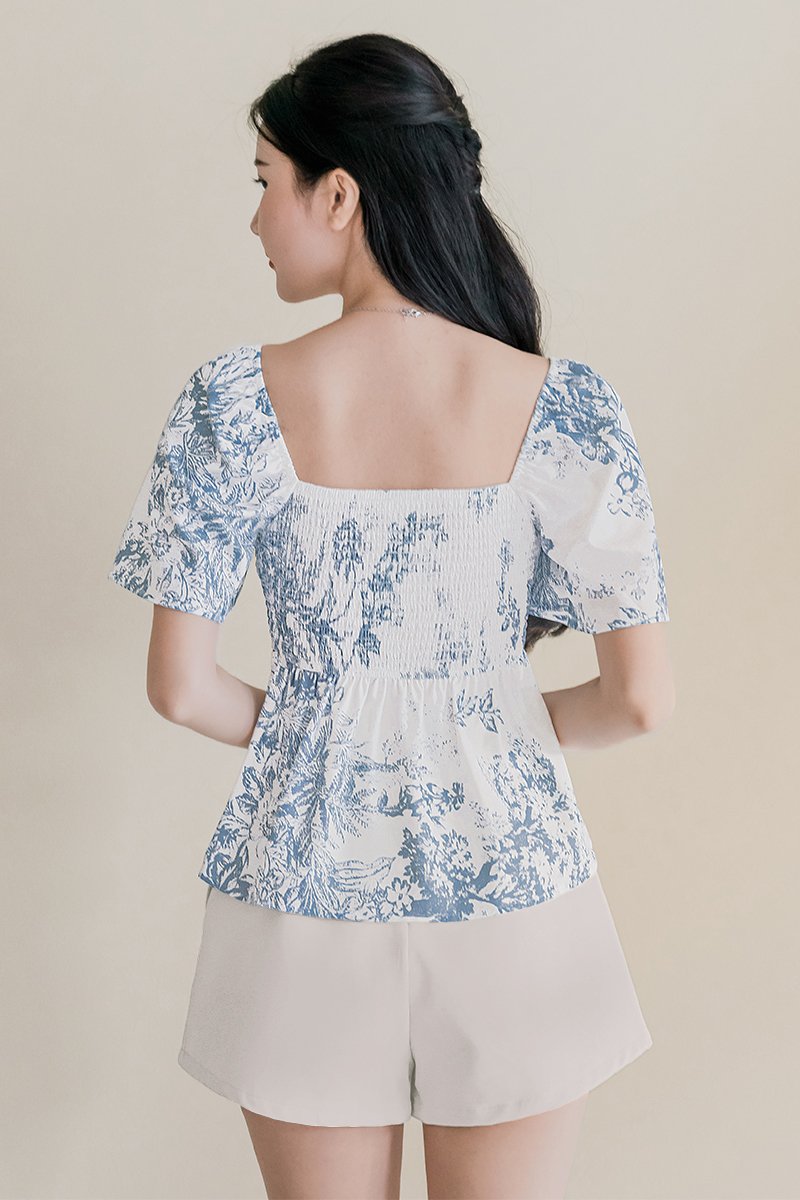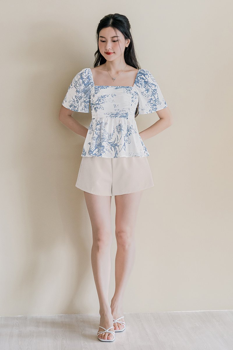 Dalsy Padded Flutter Sleeve Ruched Peplum Top V2 (Serenity Blue Earthy Bliss)