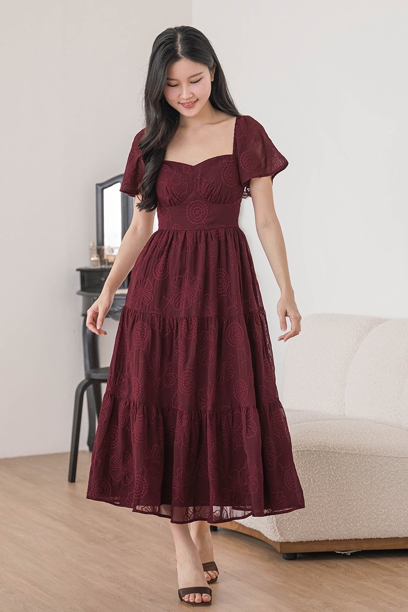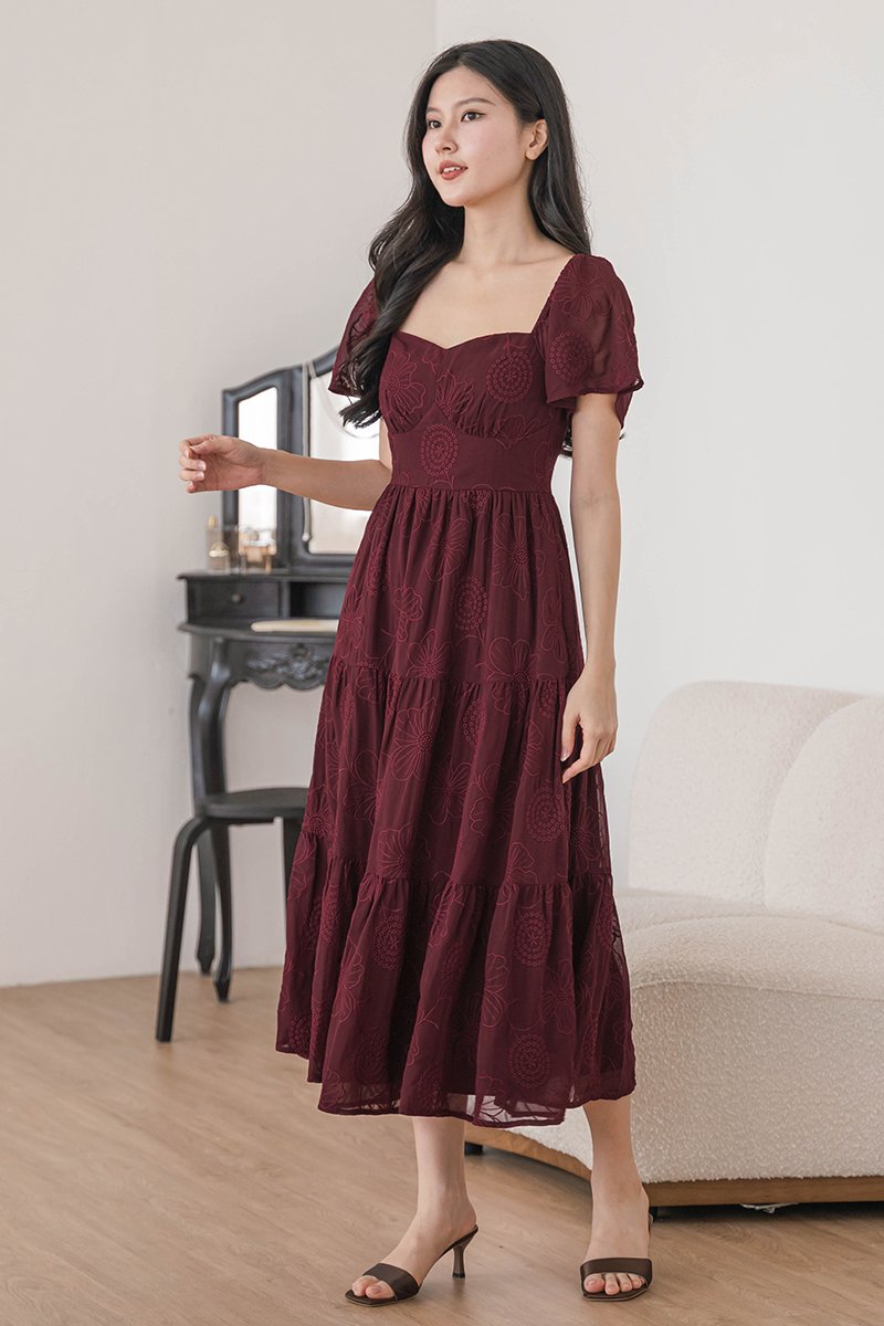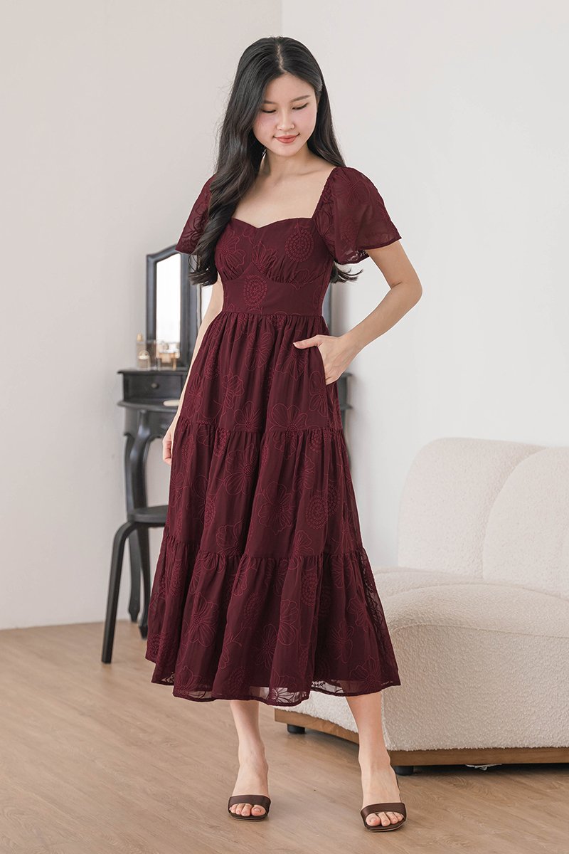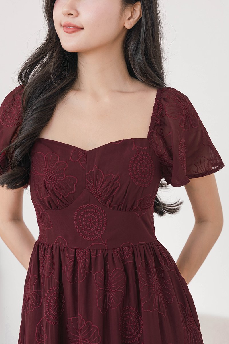 Darlene Padded Flutter Sleeve Embroidery Midi Dress V2 (Wine)