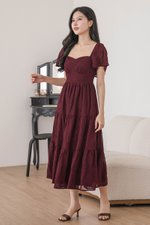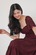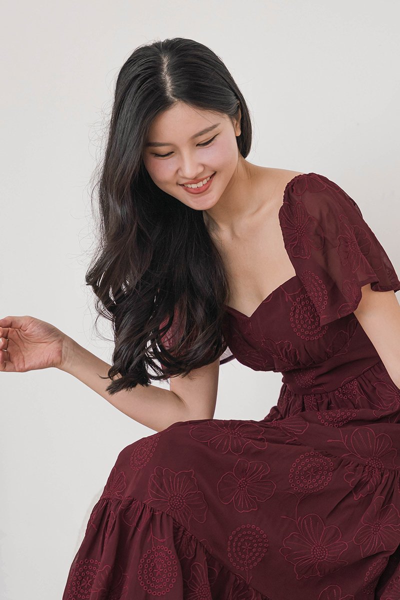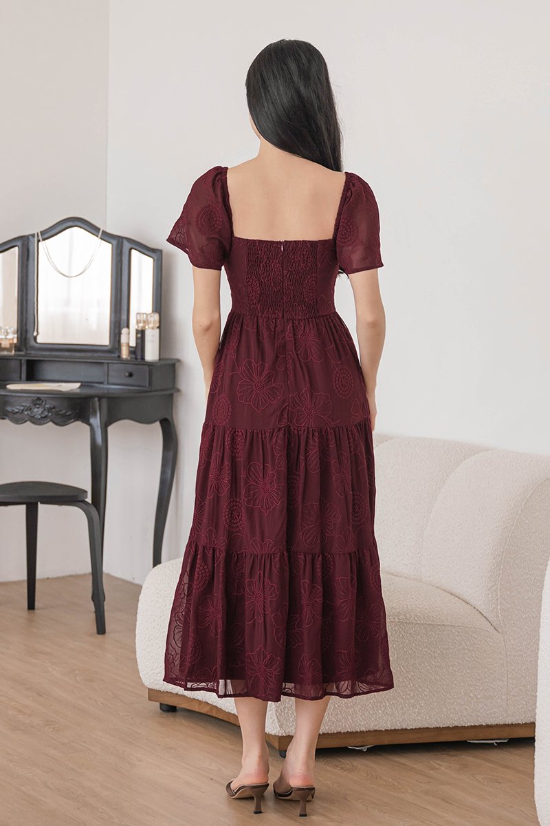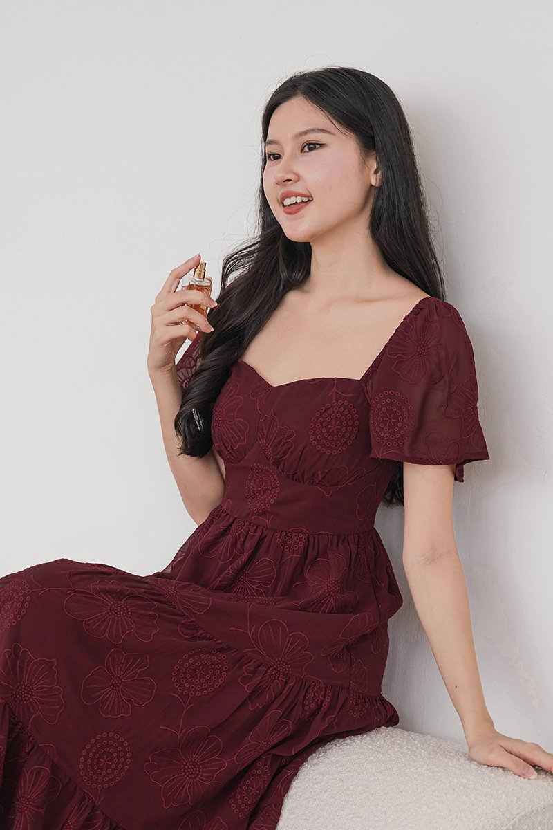 Darlene Padded Flutter Sleeve Embroidery Midi Dress V2 (Wine)