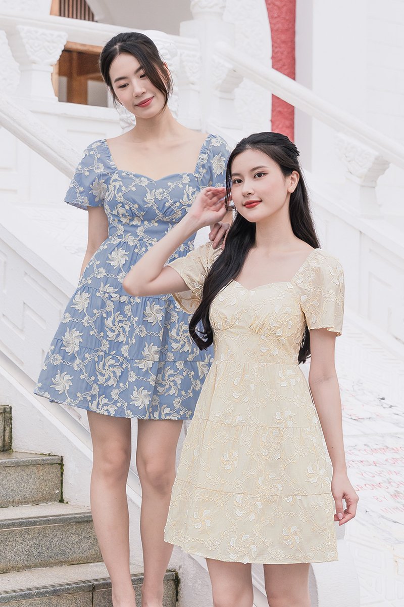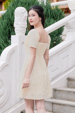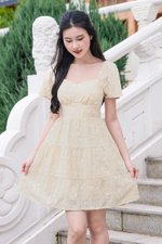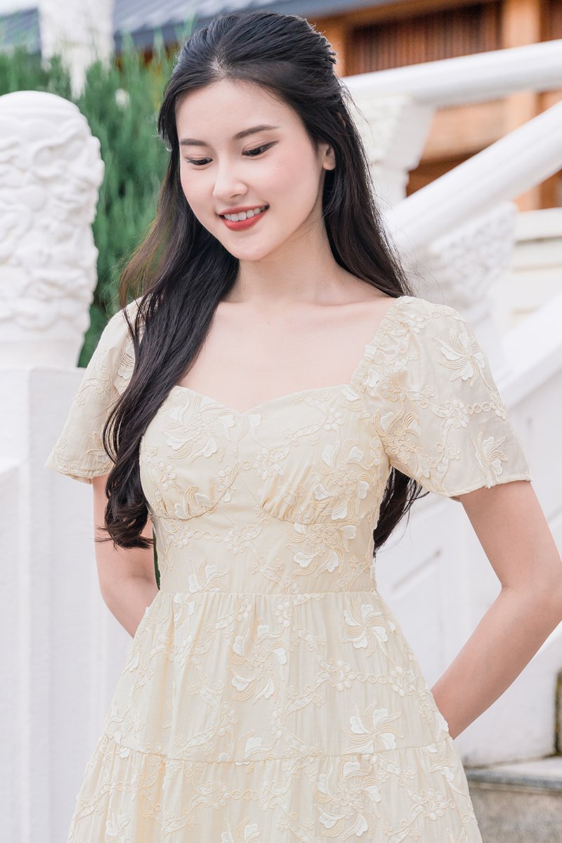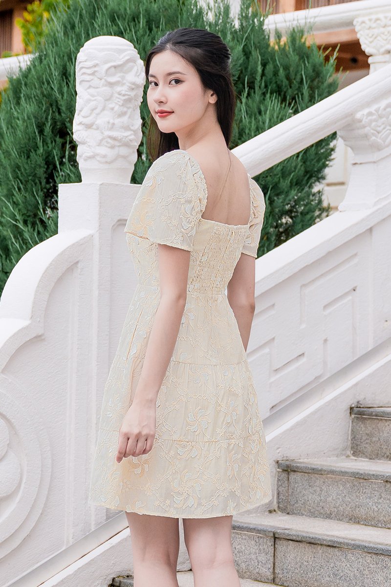 Darley Padded Flutter Sleeve Embroidery Dress (Cream Textured Floral)