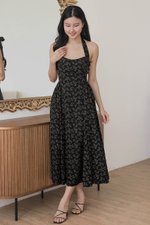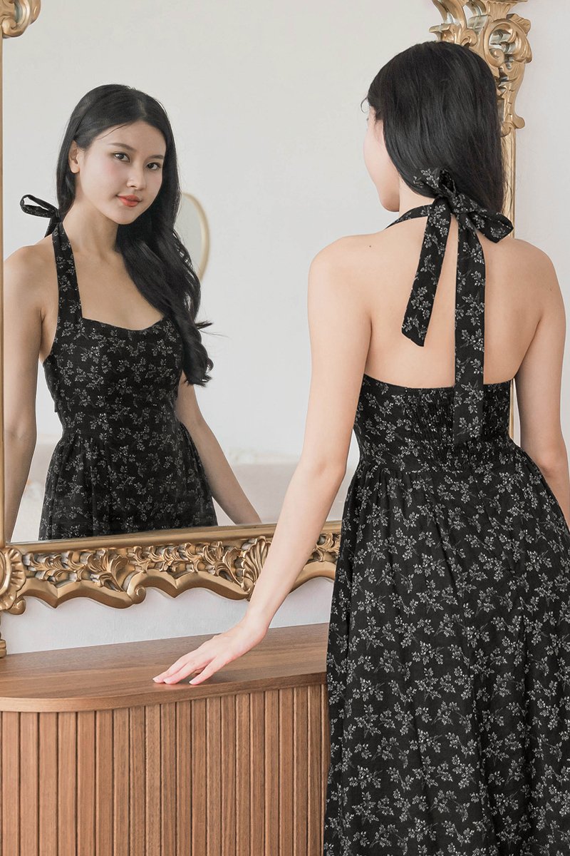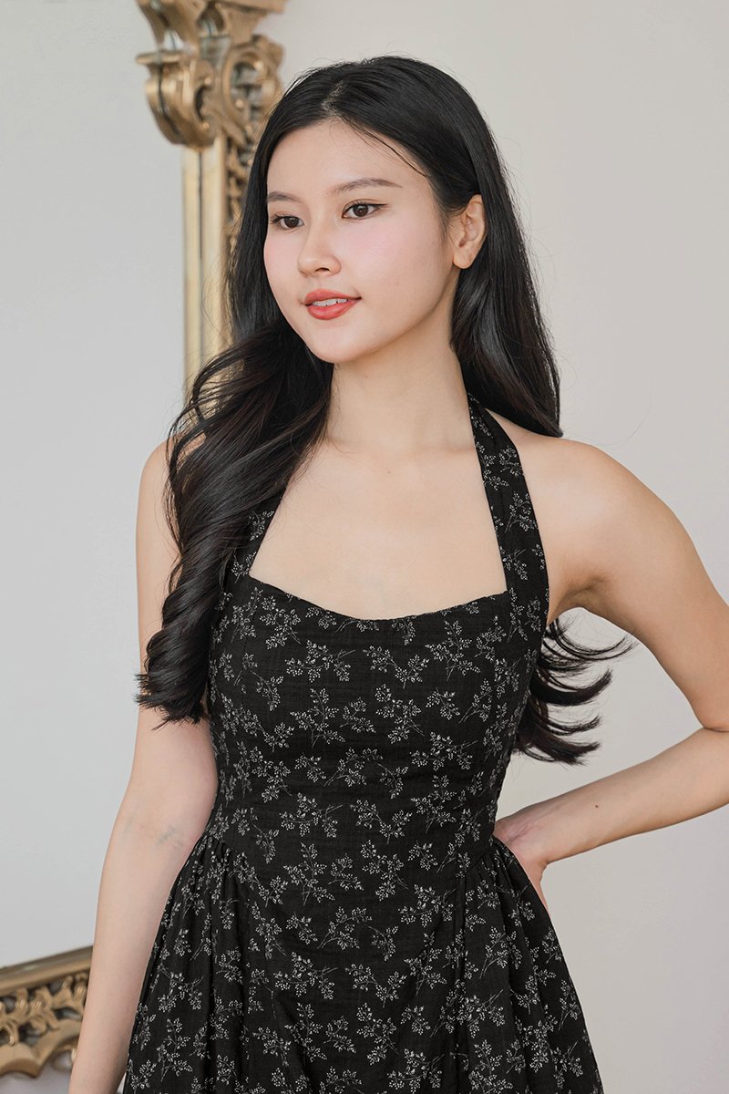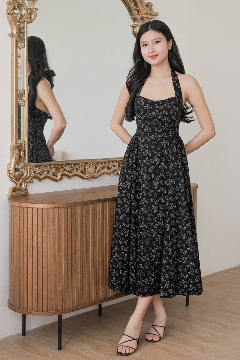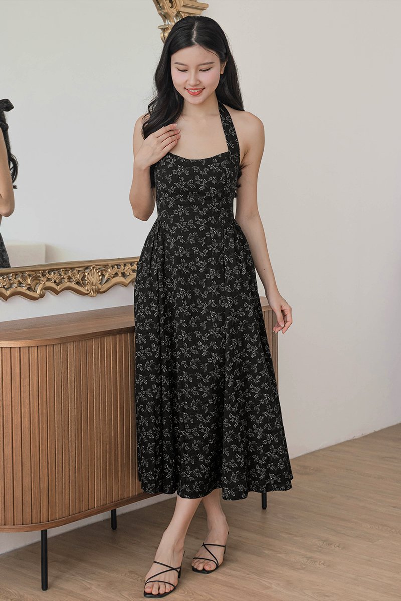 Diana Padded Curved Waist Halter Midi Dress (Black Floral)