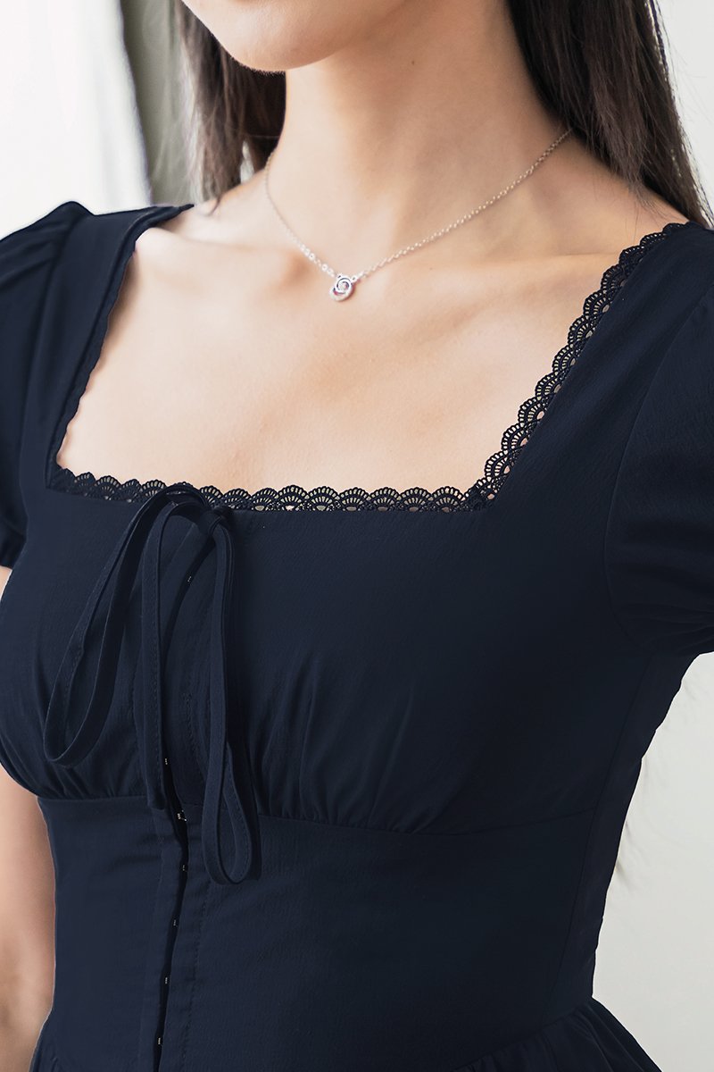 Shine through any occasion in the Hazelle Dress, where corset details add a whimsical touch to timeless silhouette. Finished with delicate lace trimming at the neckline for added femininity.