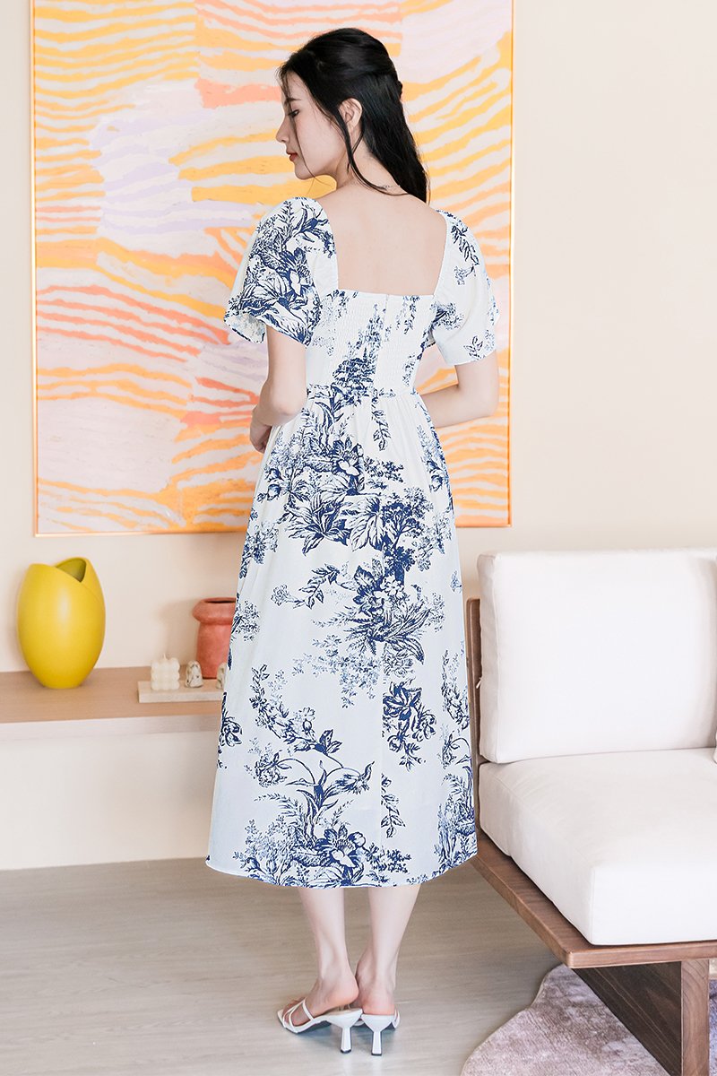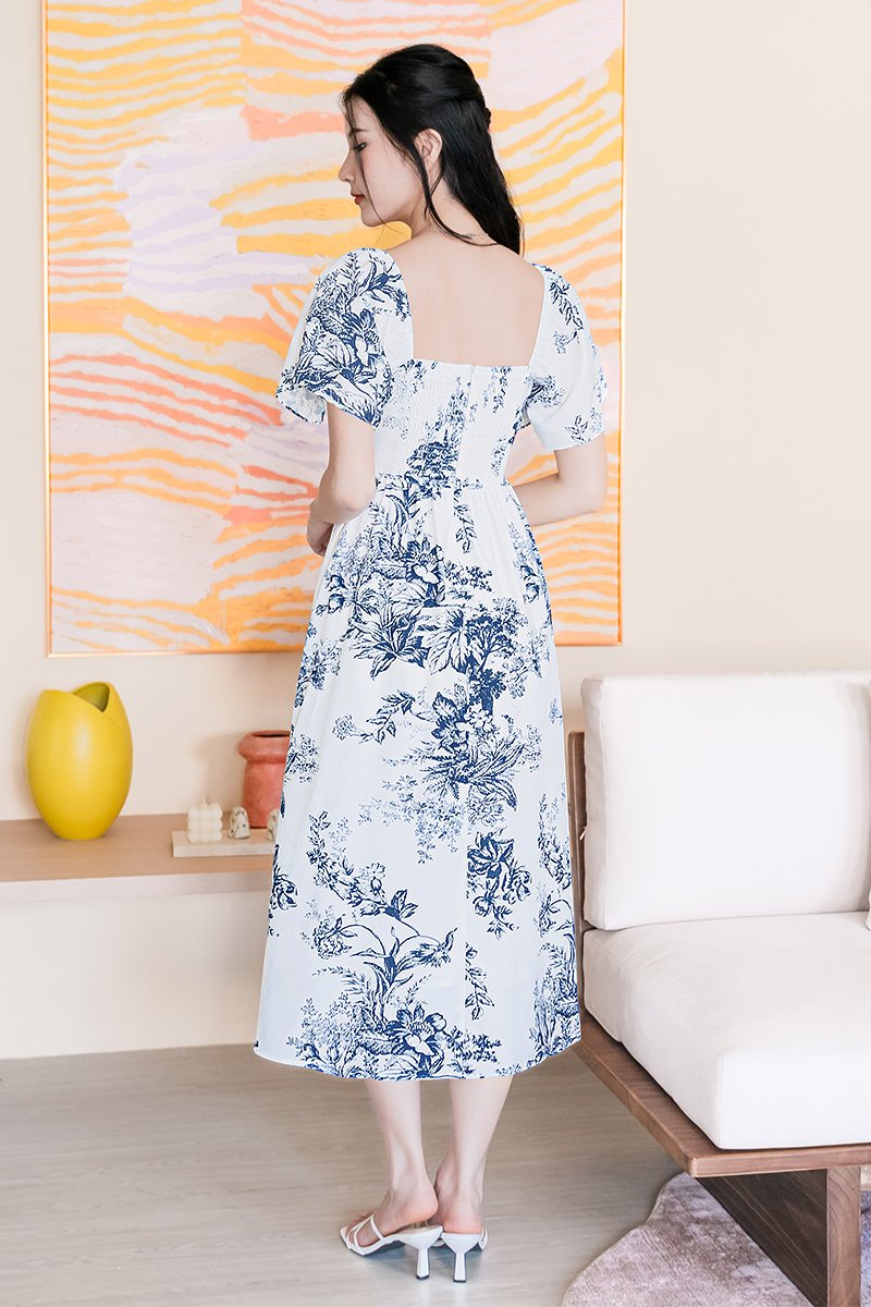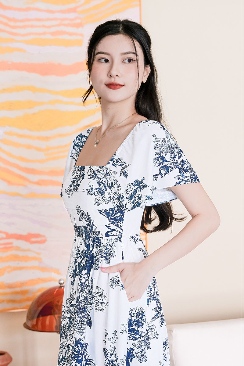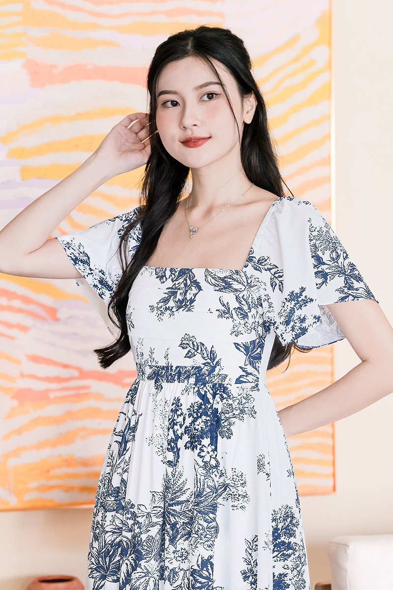 Heather Padded Flutter Sleeve Folds Midaxi Dress (Navy Earthy Bliss)