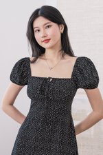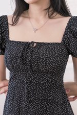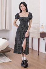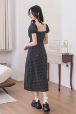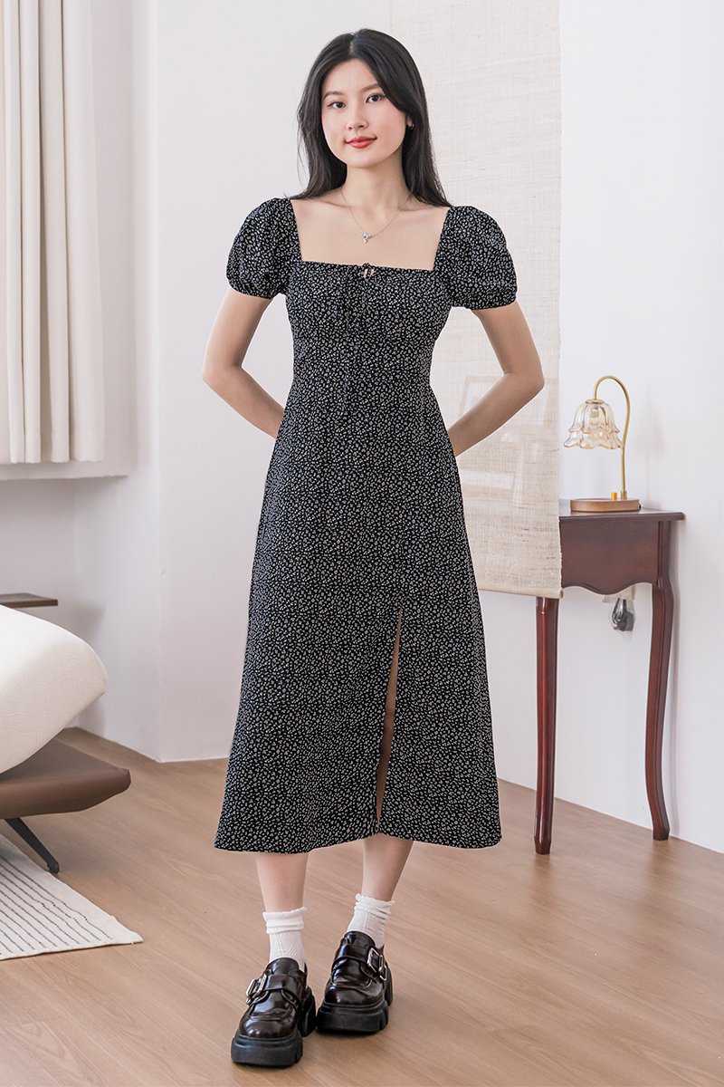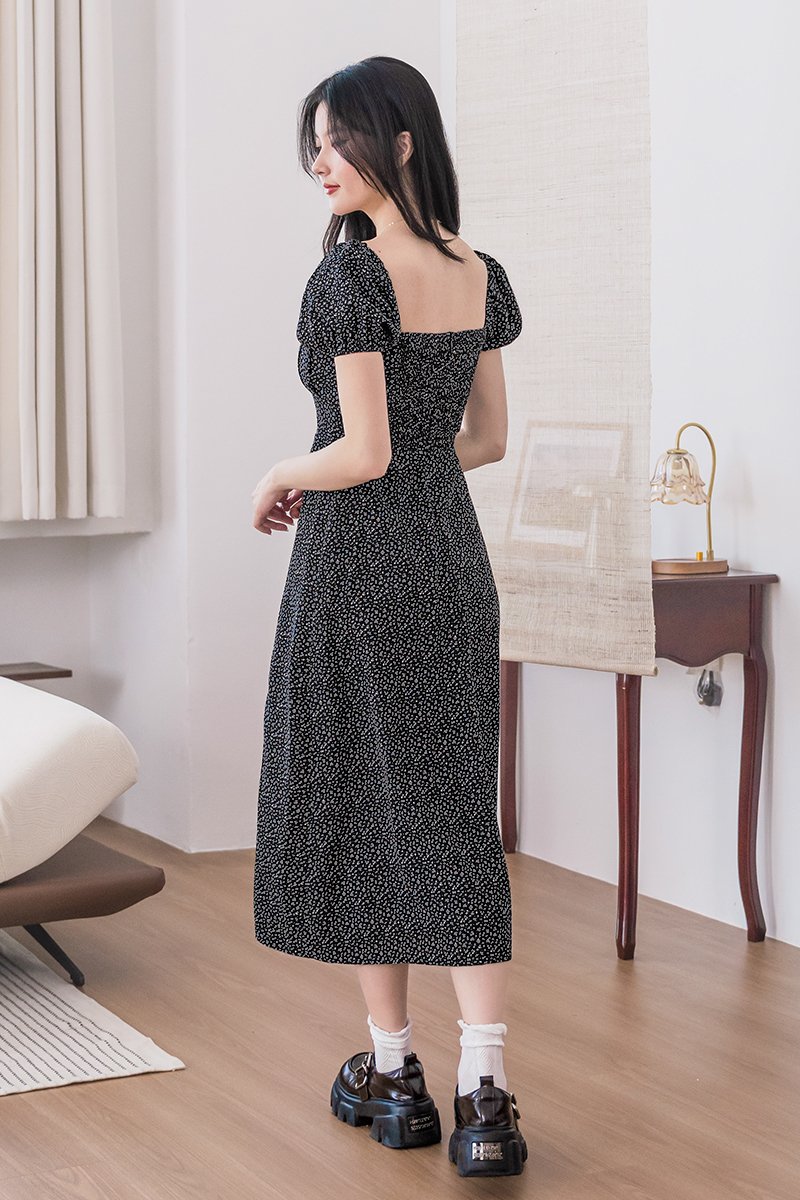 Johanna Padded Pleat Front Slit Midi Dress (Black Wildflowers)