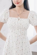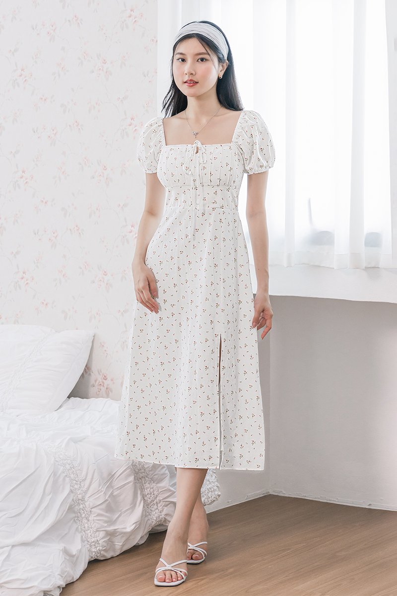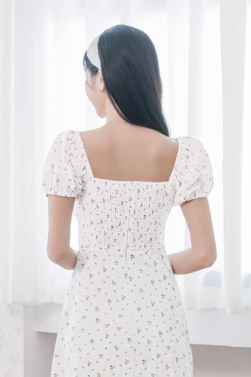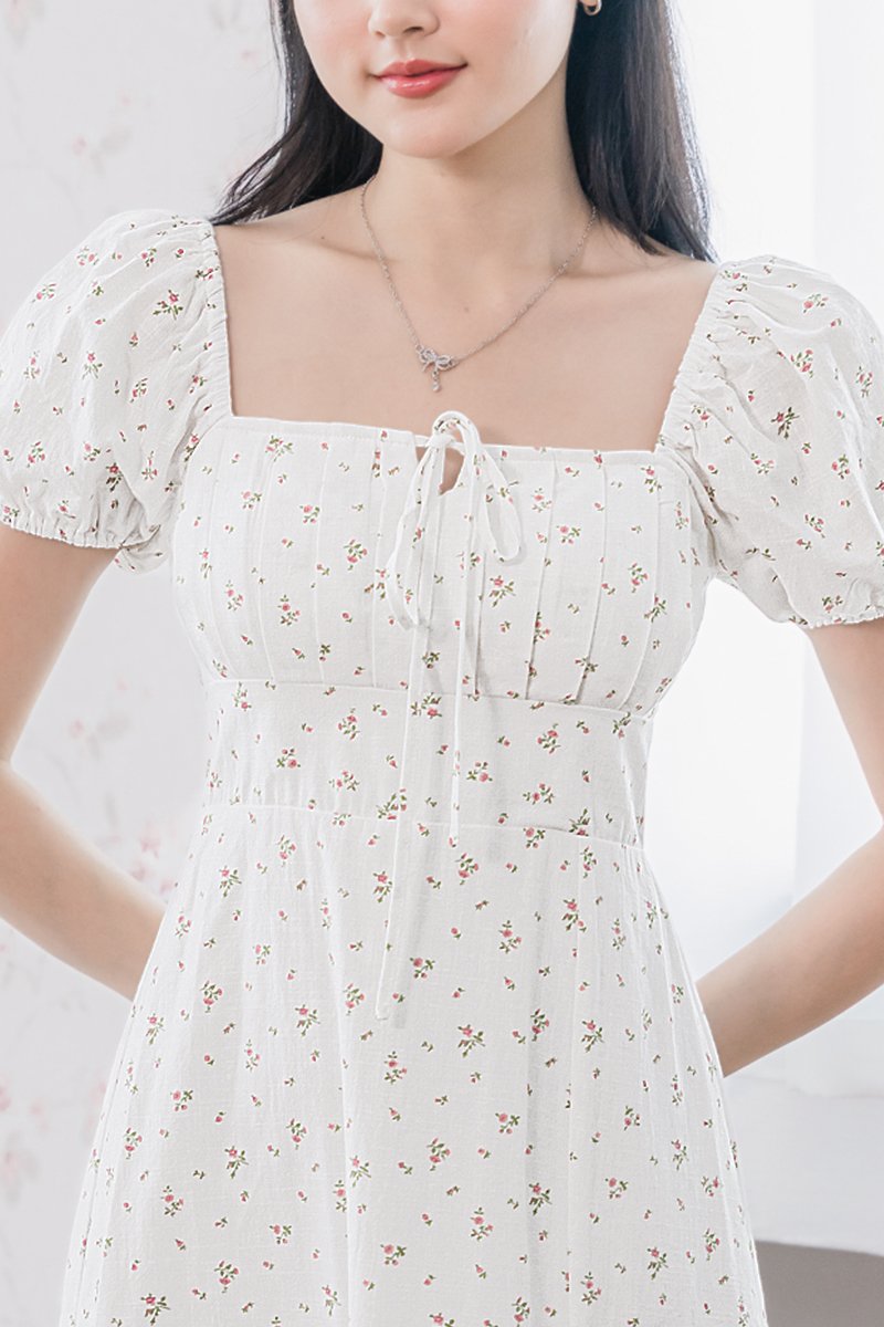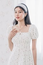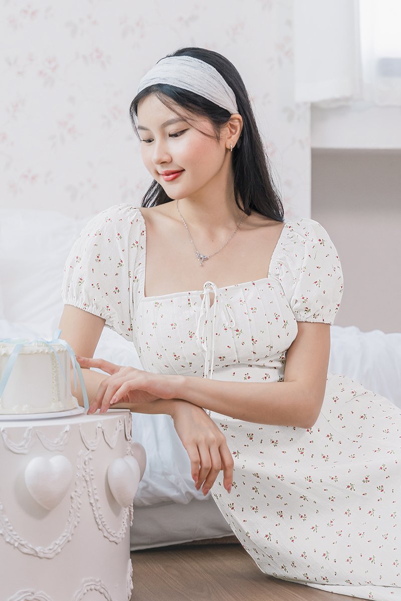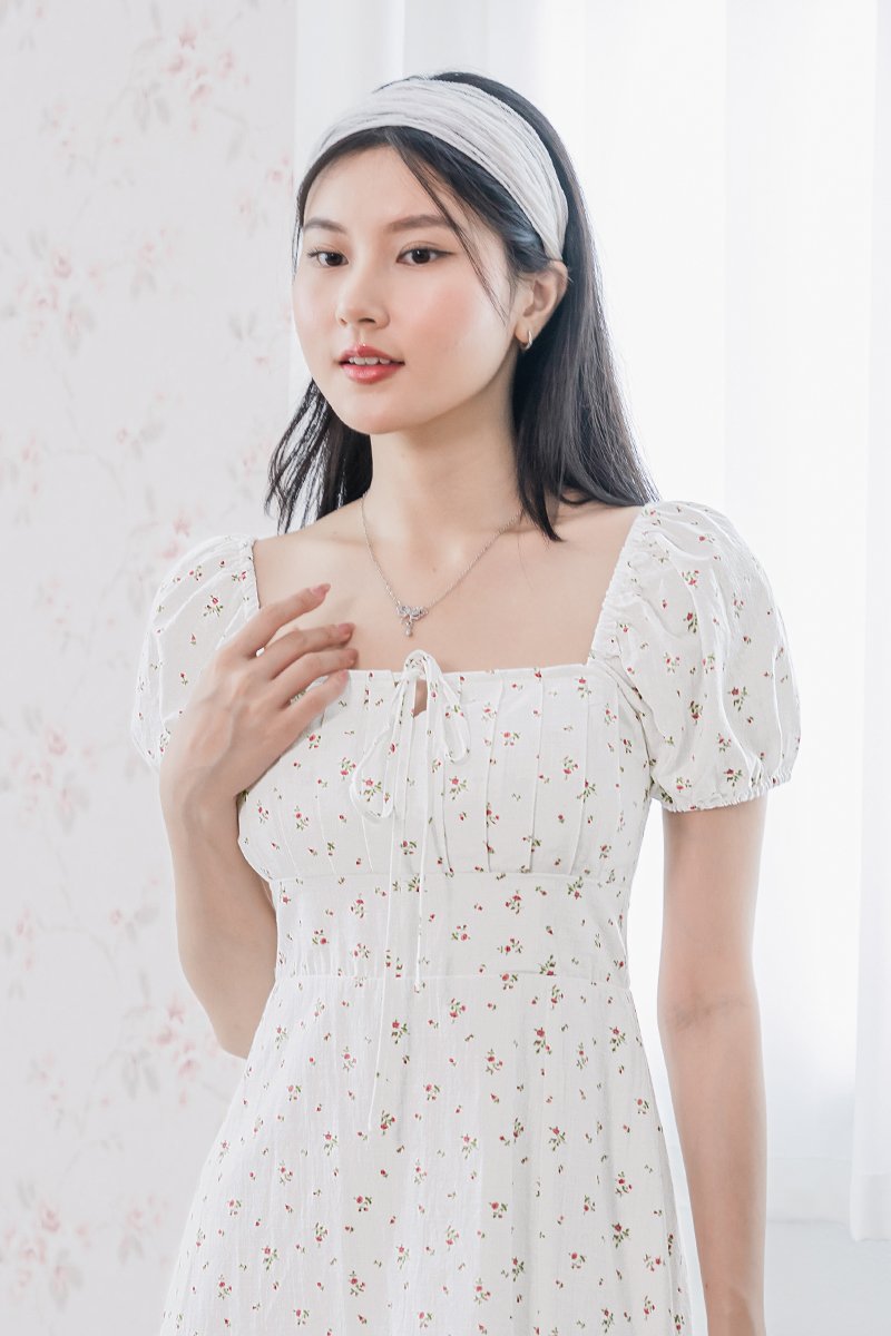 This padded dainty floral midi dress is your throw-on-and-go solution in this humid weather. Cut in the most dreamy silhouette with dainty puff sleeves, look demure and feminine in Johanna from desk to dinner. Featuring a unique big pleats design at the bust, decorated with a non-functional tie-ribbon at the neckline for an added touch of detail.