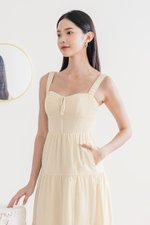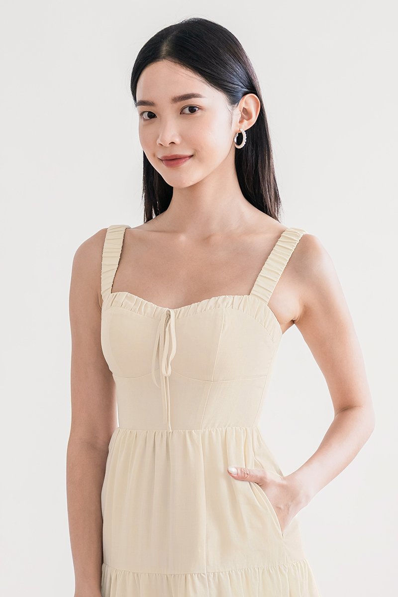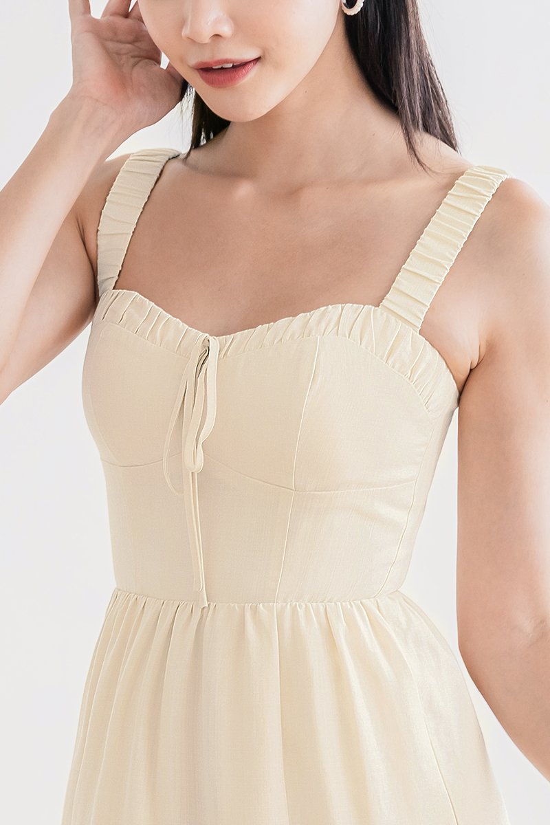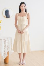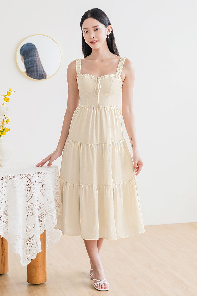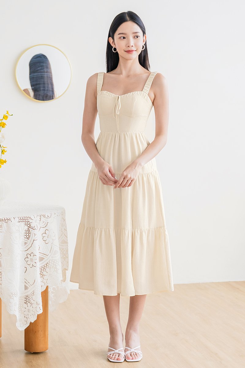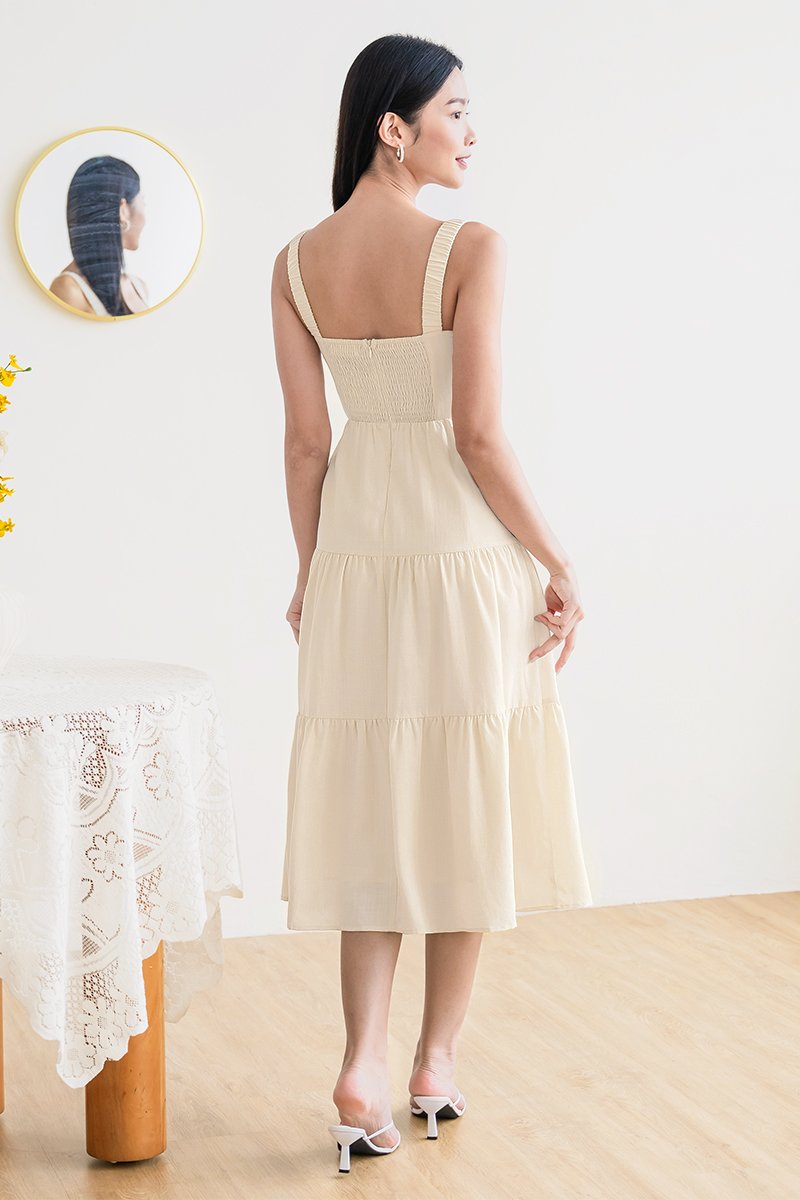 Laura Padded Ruched Strap Midi Dress (Cream Oat)
