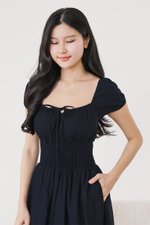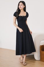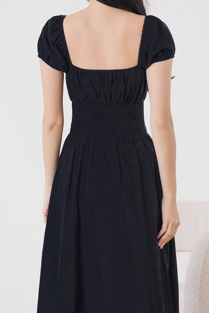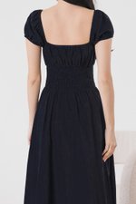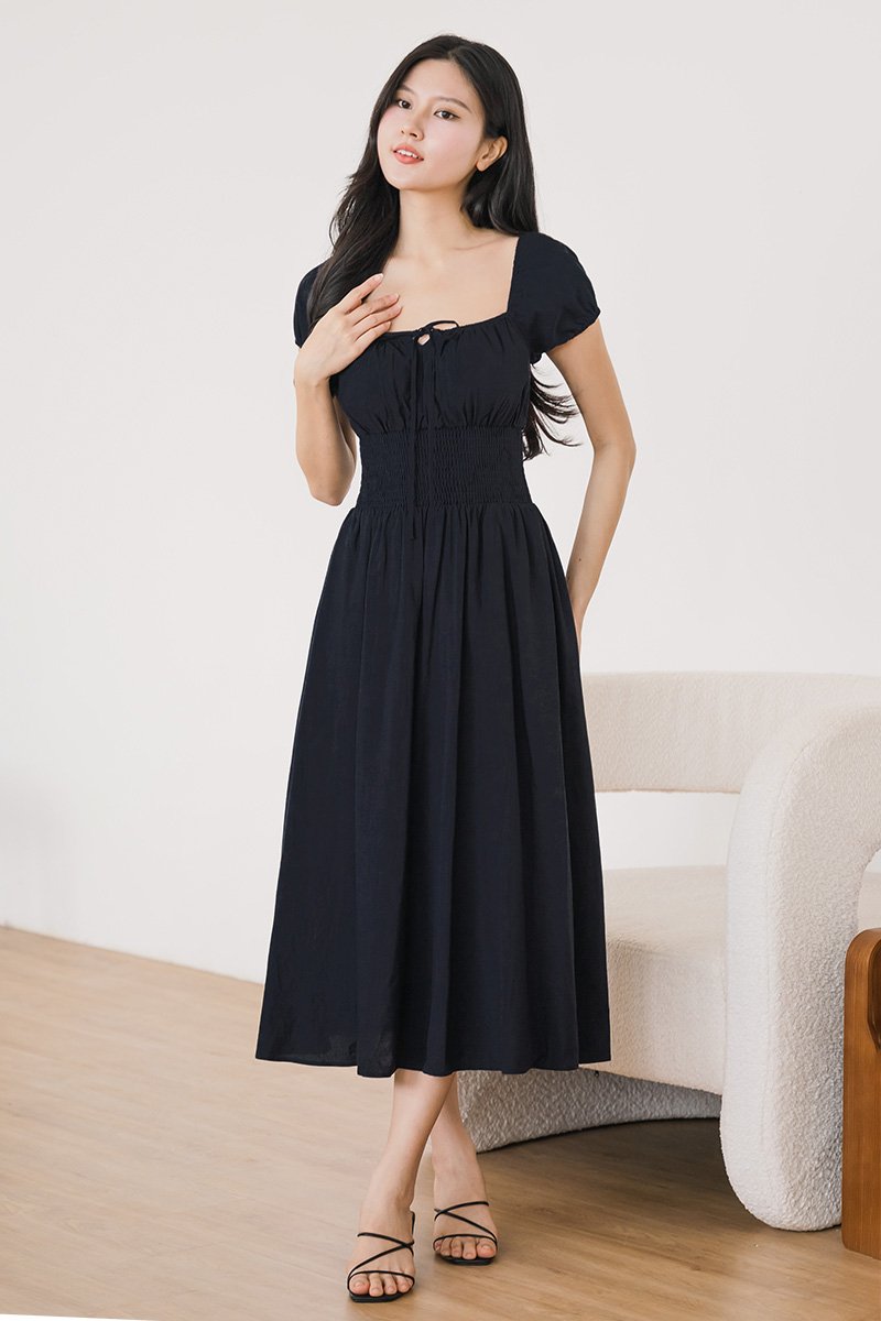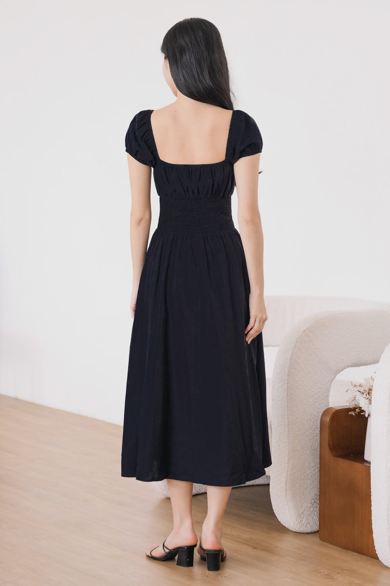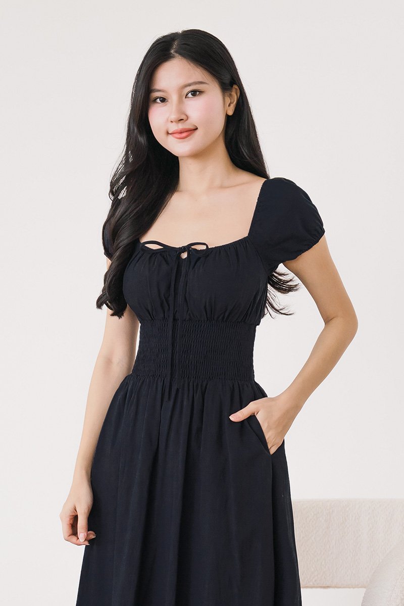 Louise Padded Smocked Waist Linen Dress (Midnight)
