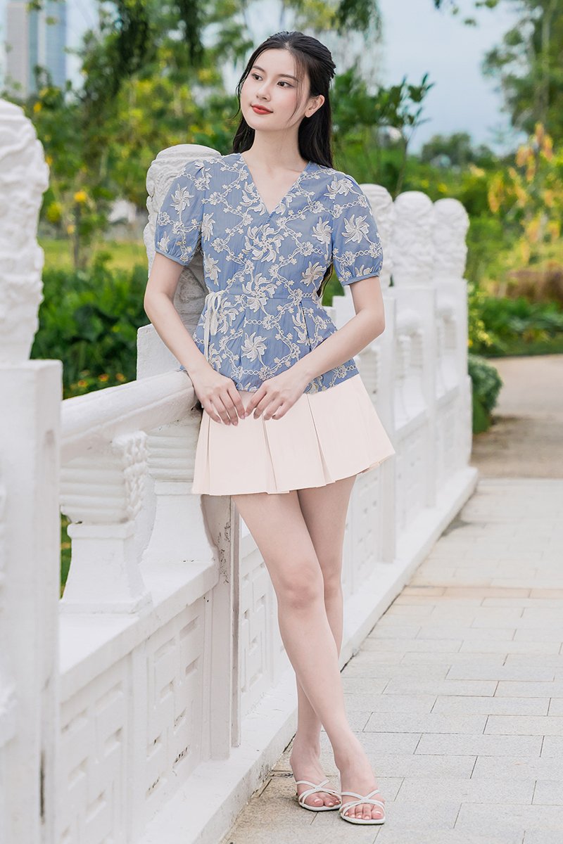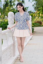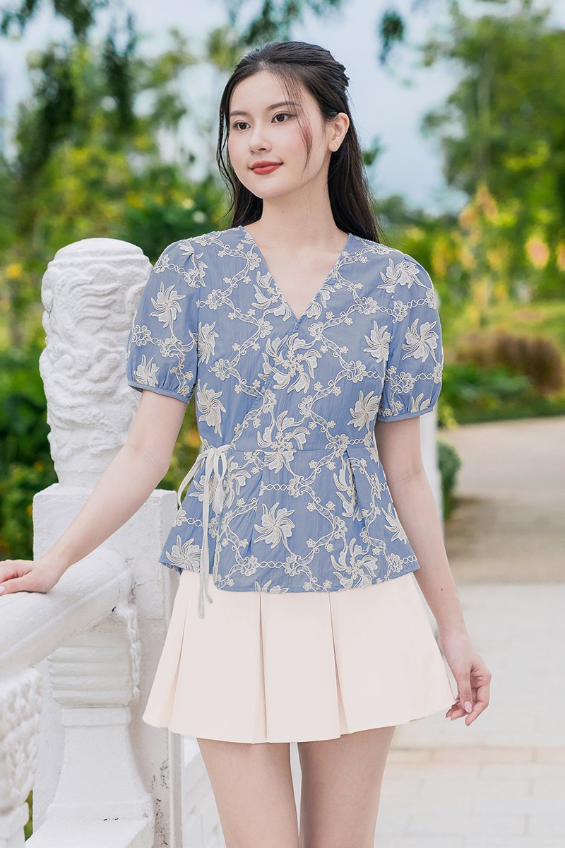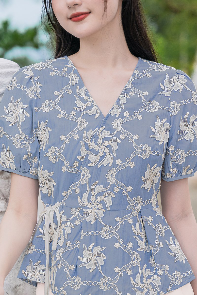 Mirabelle Wrap Ribbon Peplum Top (Blue Textured Floral)