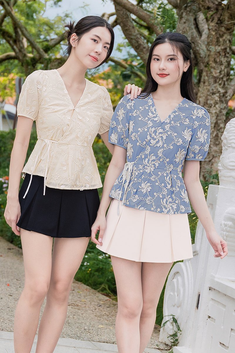 Mirabelle is a perfect combination of comfort and grace. Designed with a flattering wrap silhouette and finished off with a delicate tie-ribbon at the waist, this intricate 3D-embroidery top will effortlessly elevate your everyday look.
