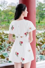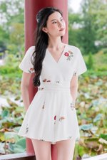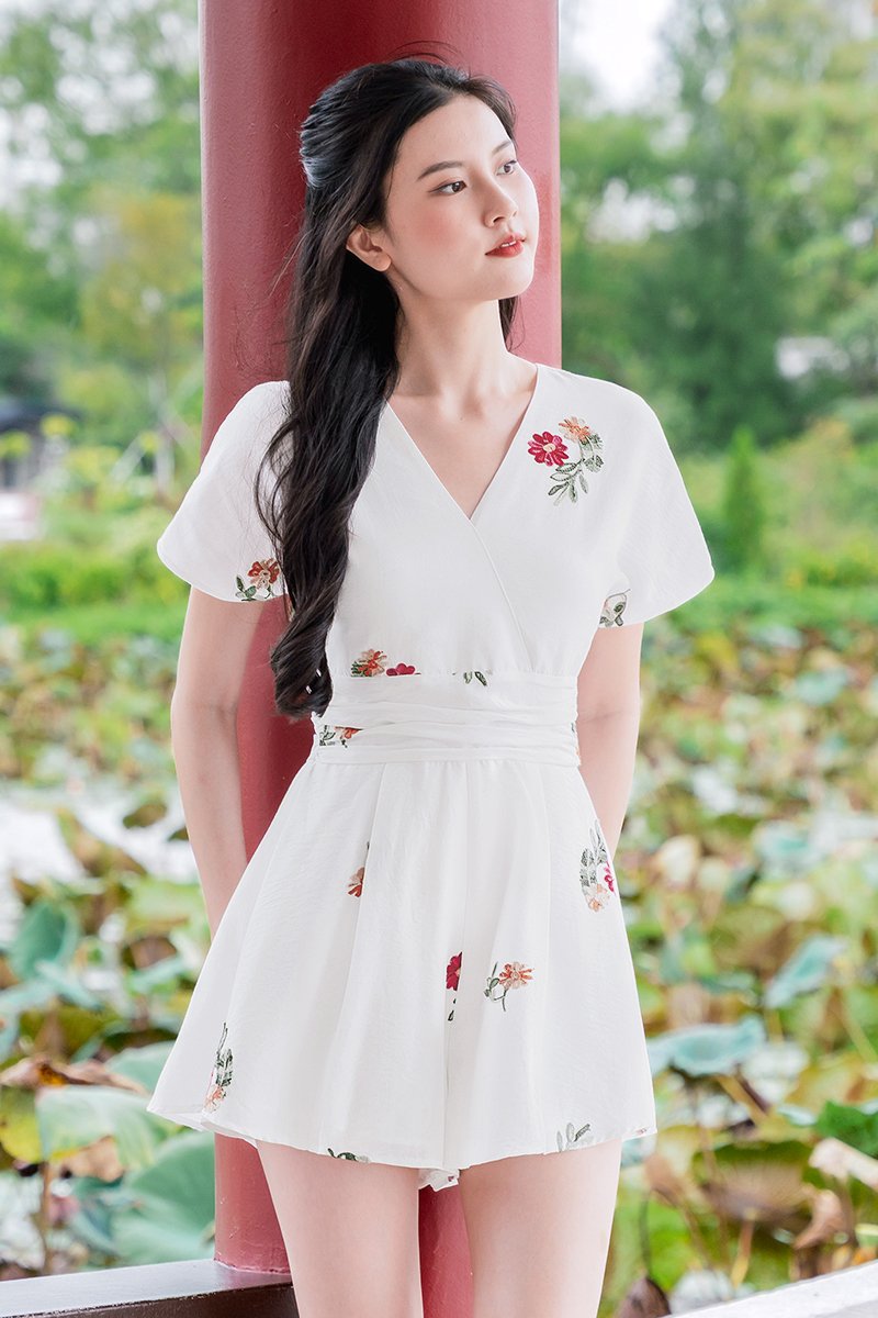 Our signature kimono-inspired wrap design making a comeback in a romper silhouette - Kara Romper balances comfort and style. Delicate floral embroidery and a cinched waistband add refined charm, perfect for your festive celebrations and beyond!
