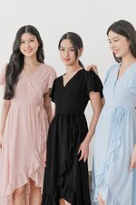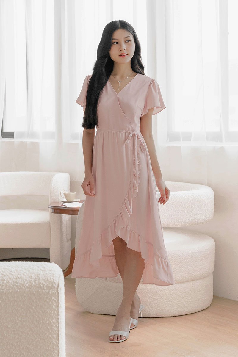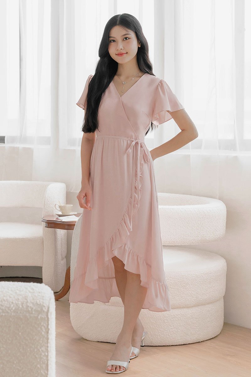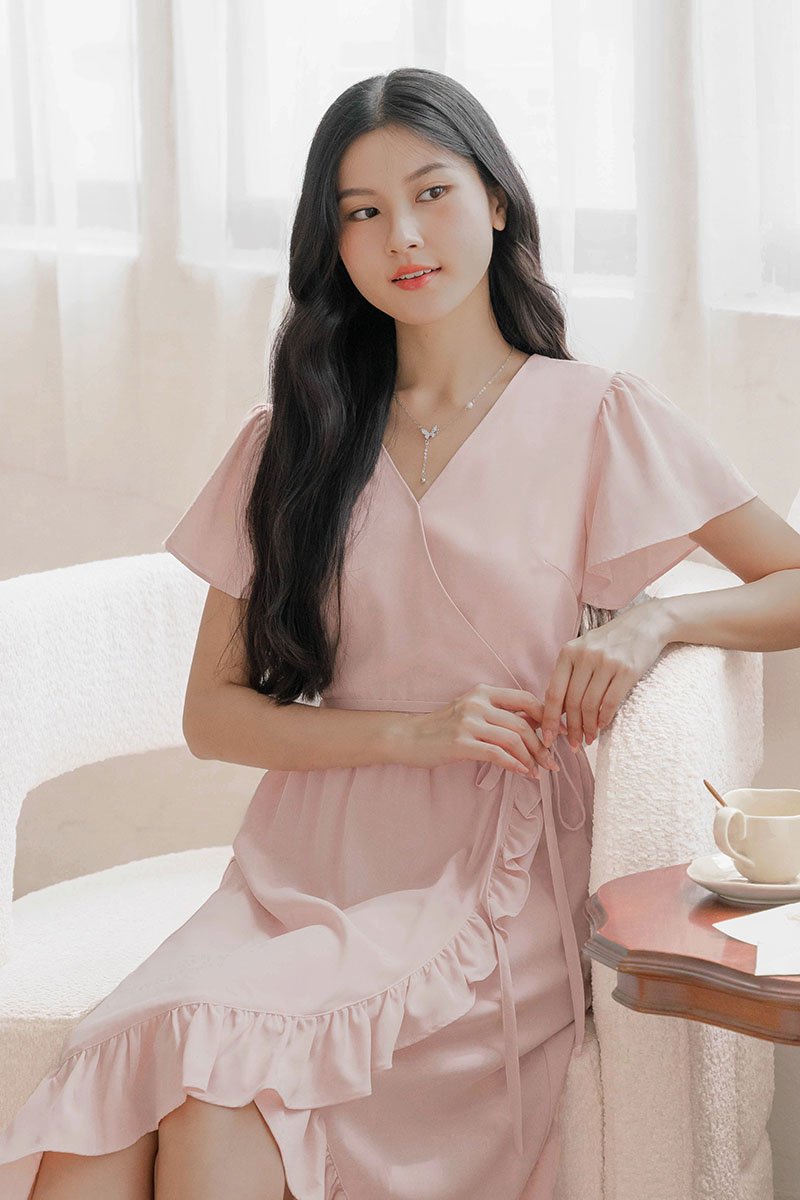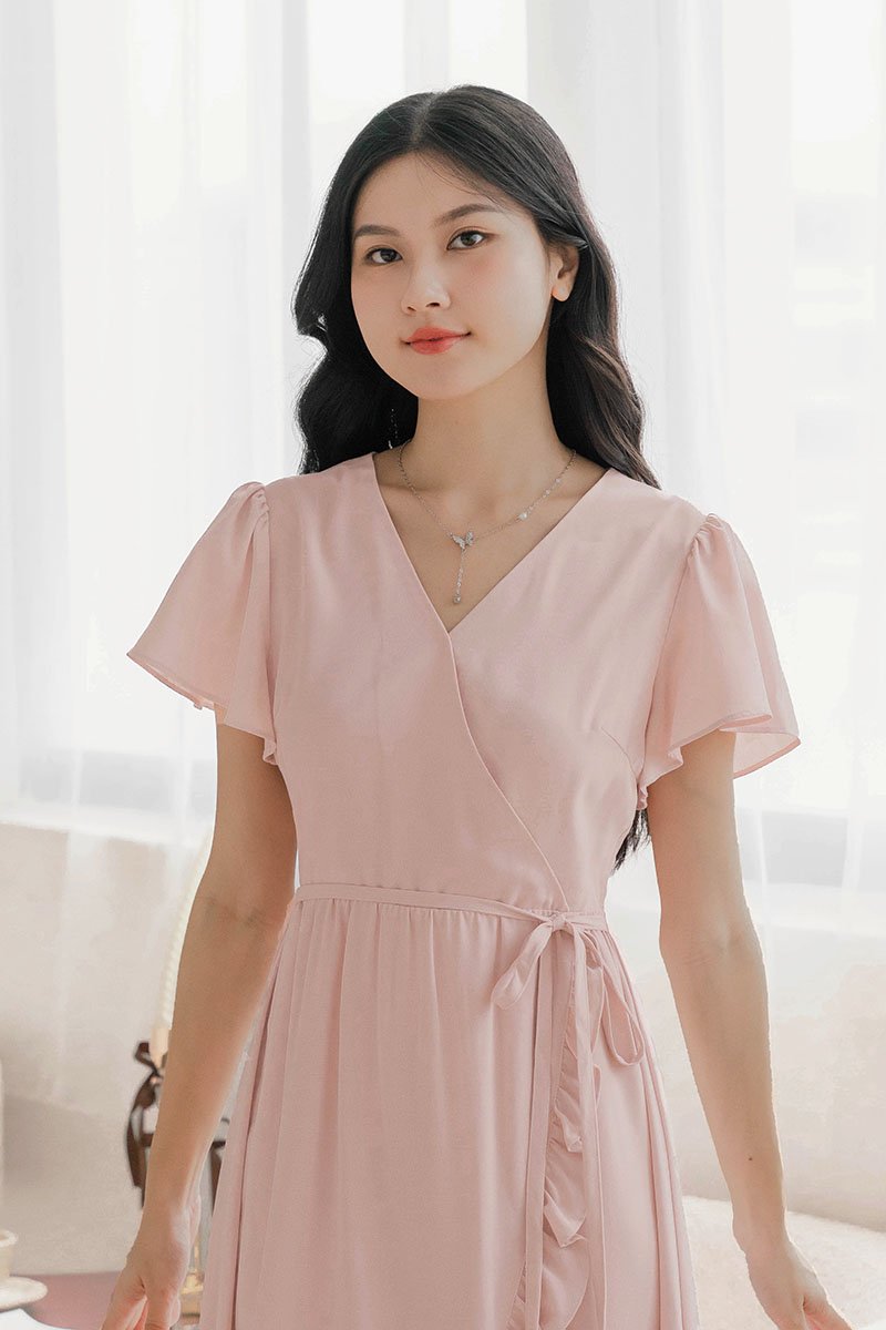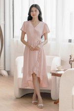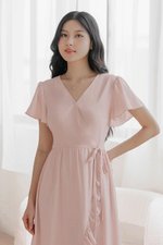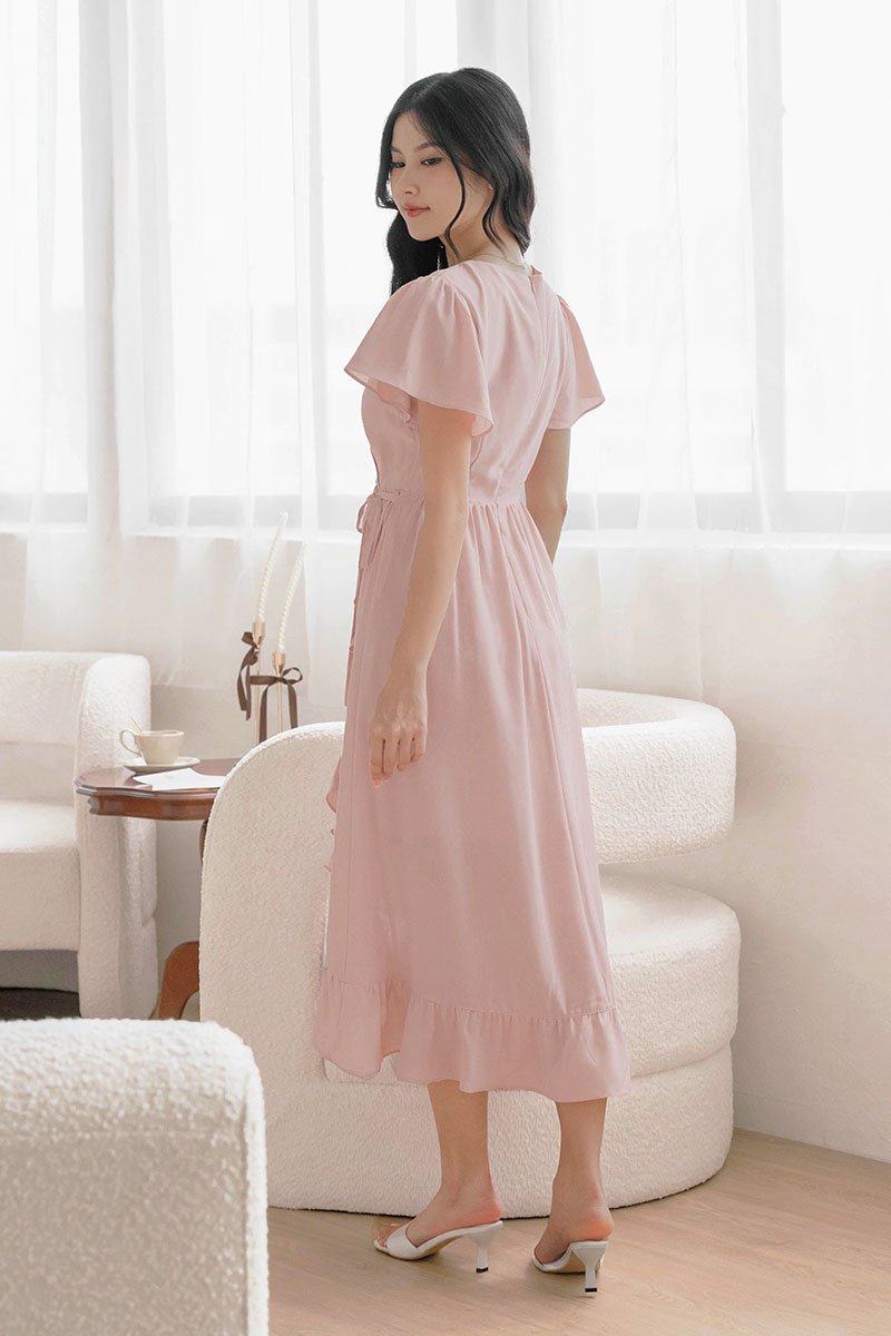 *PREORDER - ETA 24 NOV* Claudia Flutter Sleeve Wrap Midi Dress (Pink)
