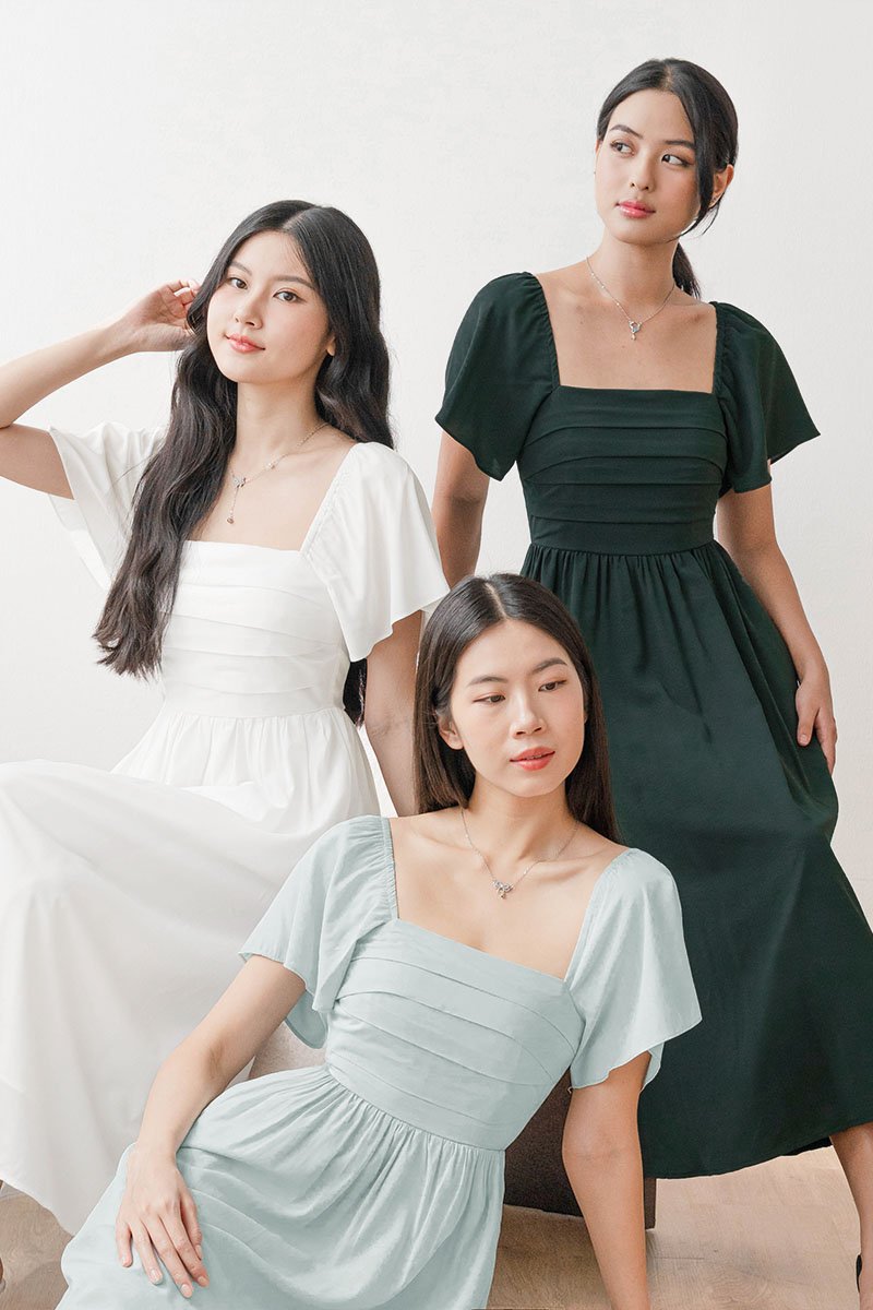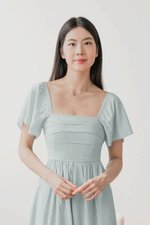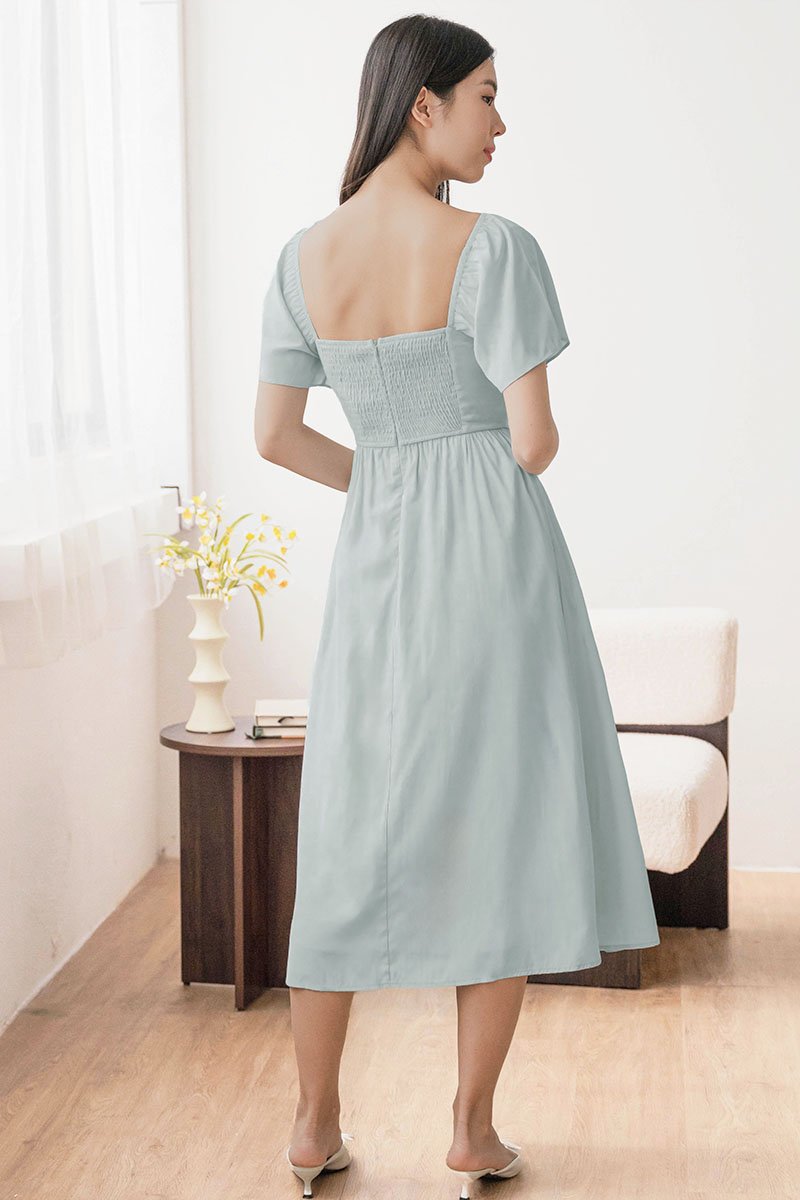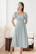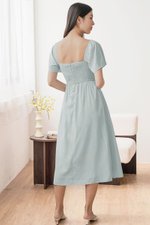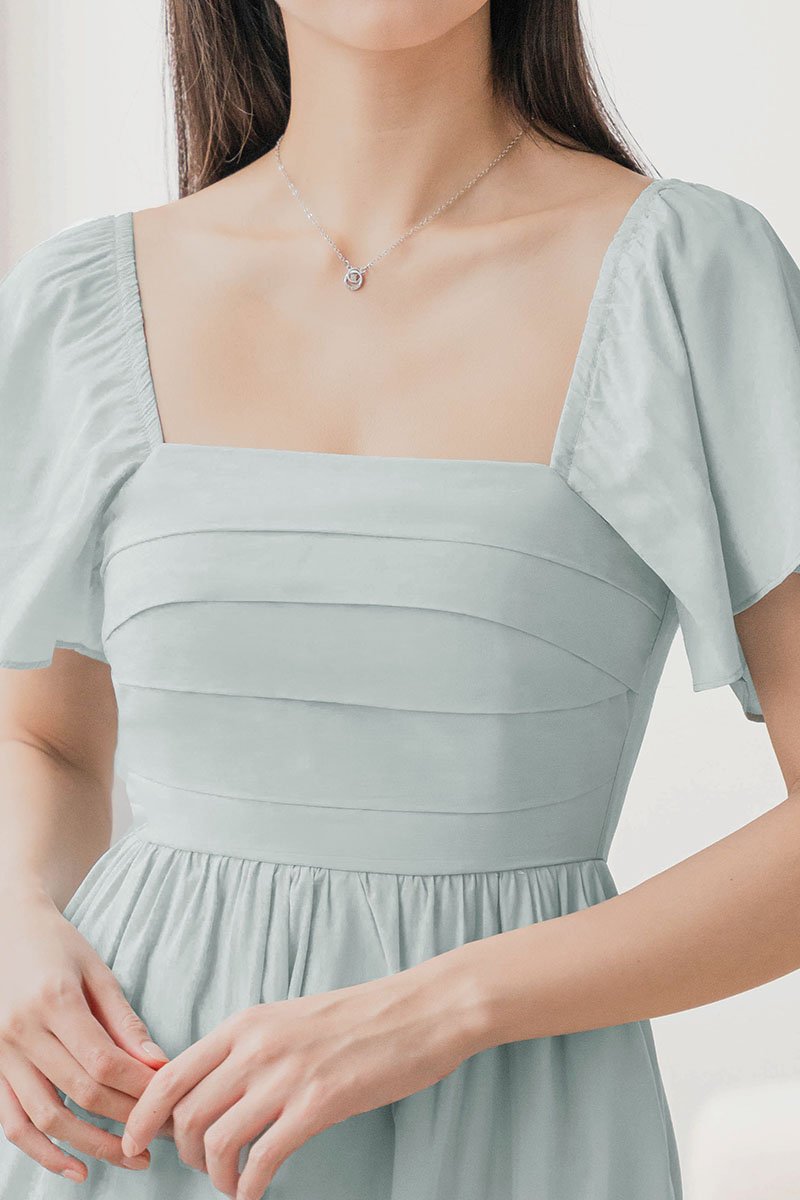 *PREORDER - ETA 24 NOV* Heather Padded Flutter Sleeve Folds Midi Dress (Mint Blue)