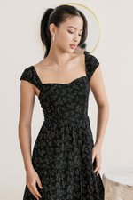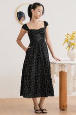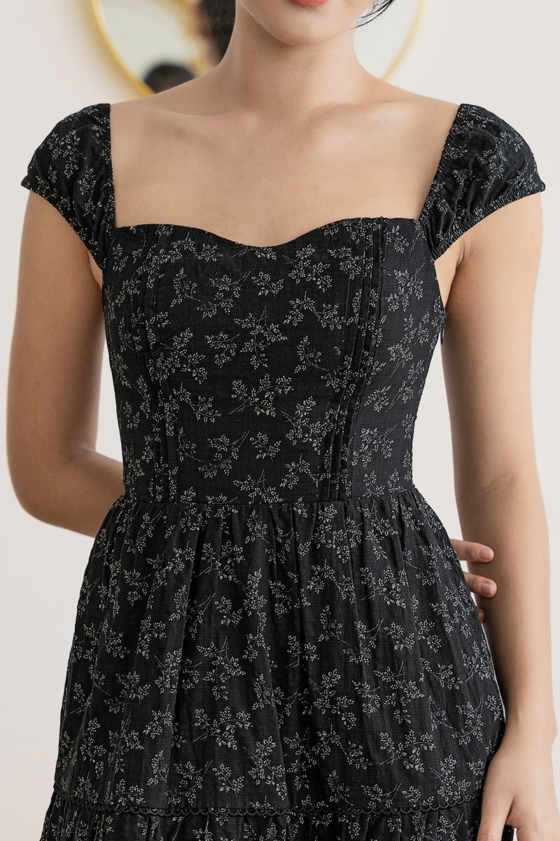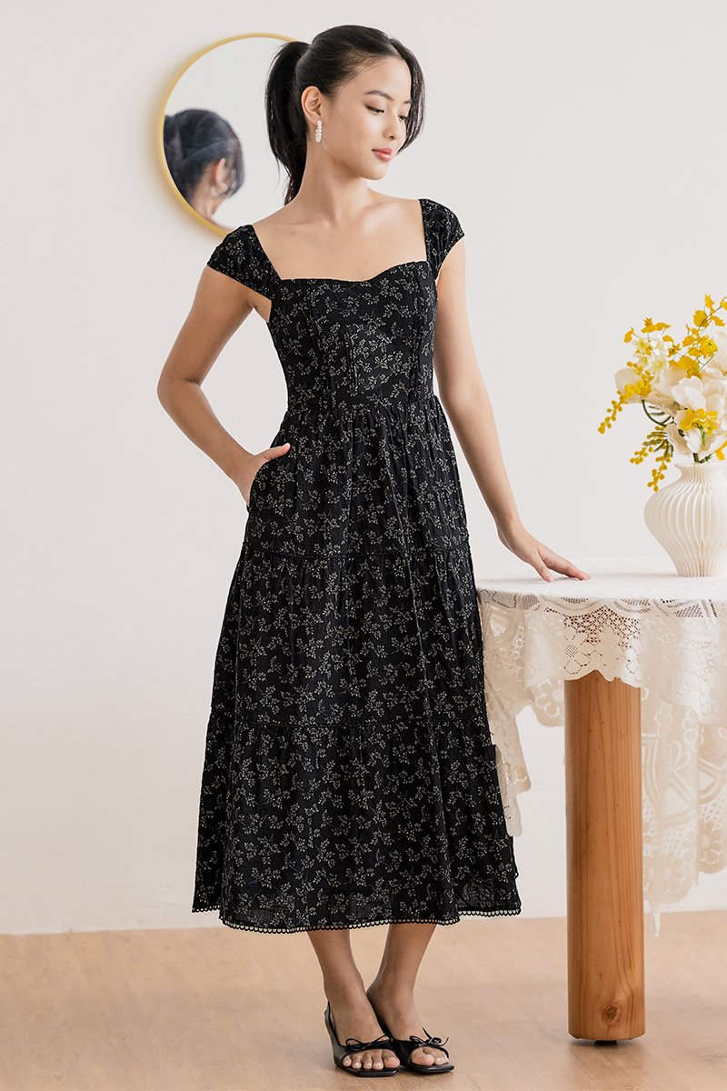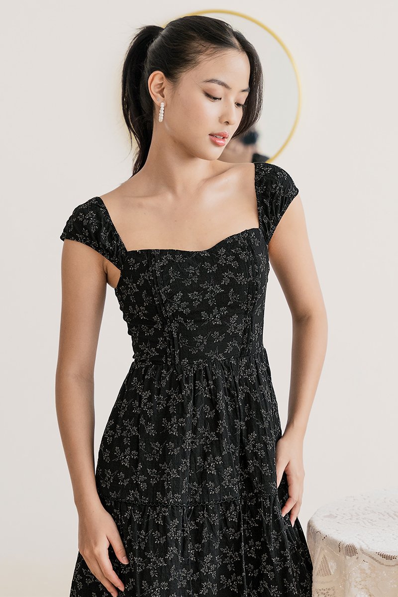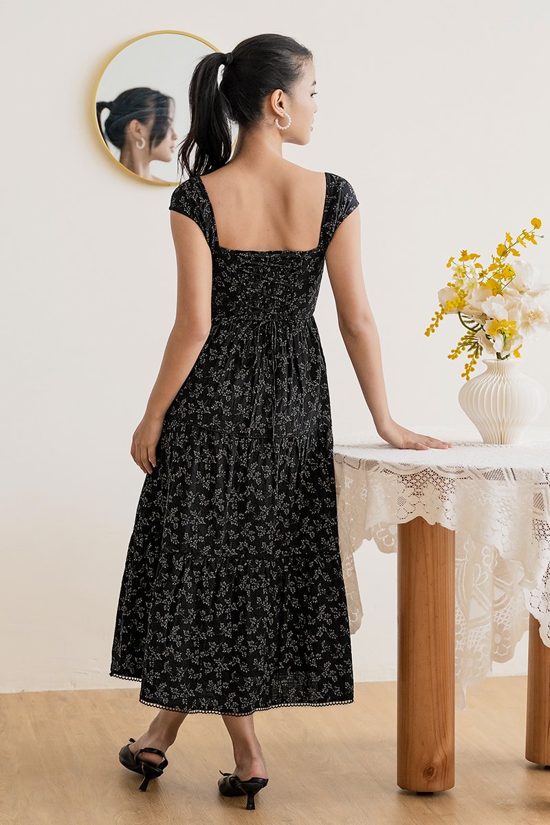 Rosie Padded Tiered MIdaxi Dress (Black Floral)